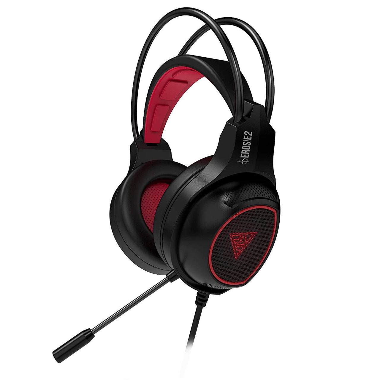 Casti Gamdias Eros E2 negre, design ergonomic, iluminare LED multicolora, butoane control pe casca, microfon omnidirectional flexibil (dimensiuni: ∅4x1.5mm, sensibilitate: -42db±3db), difuzoare: 40mm (impedanta: 32Ω, sensibilitate: 118±3dB), conectori: USB si 3.5mm TRRS jack, lungime cablu: 2m, dimensiuni: 182x90x231mm