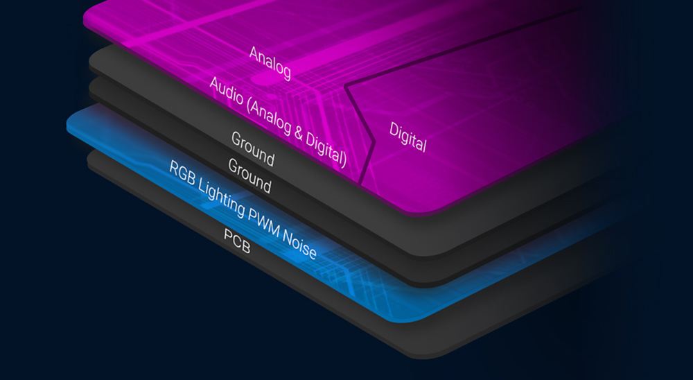 Tehnologia exclusivă ROG Hyper-Grounding utilizează o placă de circuite imprimate cu mai multe straturi și o dispunere specială pentru a preveni interferențele electromagnetice, asigurându-te că tot ceea ce auzi este un sunet pur, fără zgomot.