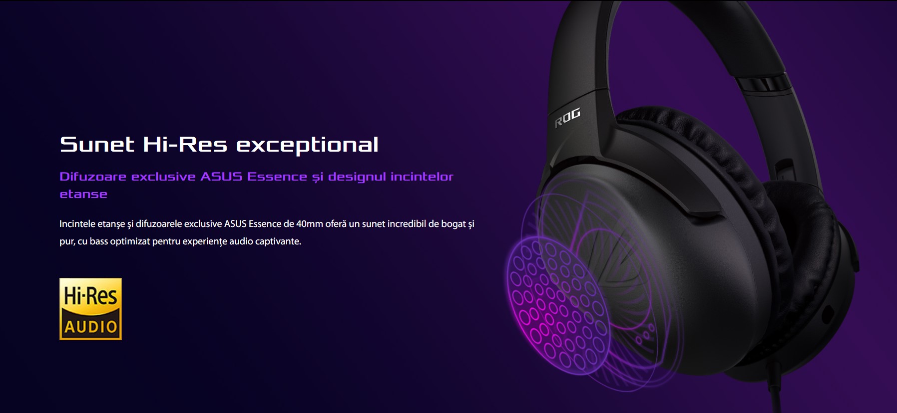 - Incinte exclusive etanse si drivere de 40 mm ASUS Essence ofera un sunet incredibil de bogat si pur, cu basi profunzi optimizati pentru o experienta audio captivanta.