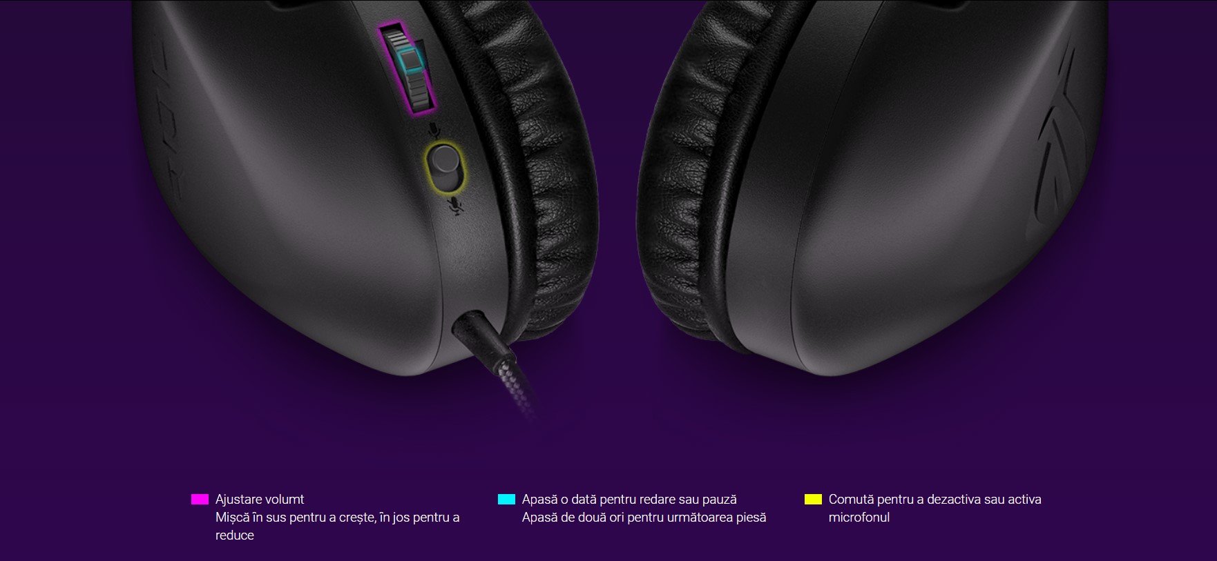- Controale fizice pe cupe pentru ajustarea facila a volumului, control media si dezactivarea microfonului.