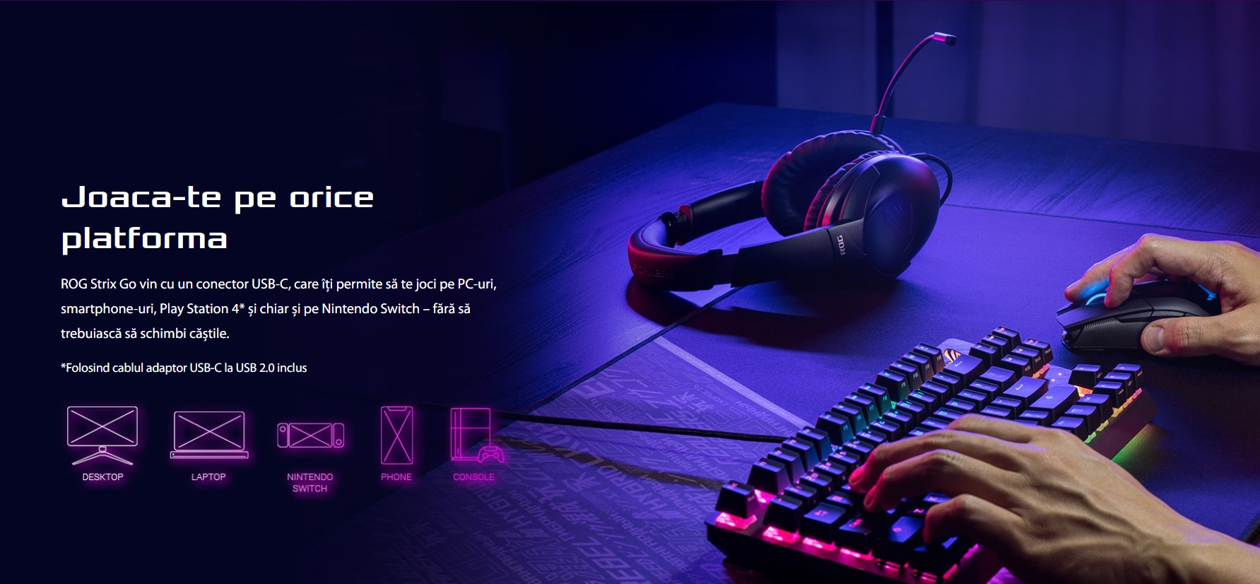 ROG Strix Go sunt casti de gaming USB-C® care suporta toate platformele tale favorite pentru gaming – PC, Mac, telefoane mobile, PlayStation 4 si Nintendo Switch. Echipate cu drivere exclusive ASUS Essence si cu incinte etanse, Strix Go ofera un sunet incredibil de bogat si de pur, cu basi profunzi optimizati, pentru experiente audio captivante. Beneficiaza, de asemenea, de un microfon de top la nivelul industriei cu anularea zgomotelor asistata de AI, care ofera comunicatii prin voce in jocuri cu o claritate de cristal, chiar si in medii zgomotoase in aer liber. Cu un design ergonomic si usor, pentru un nivel excelent de confort si cu un mecanism de pivotare si pliere pentru portabilitate rapida si facila, Strix Go se asigura ca te vei putea juca fara nicio urma de oboseala.