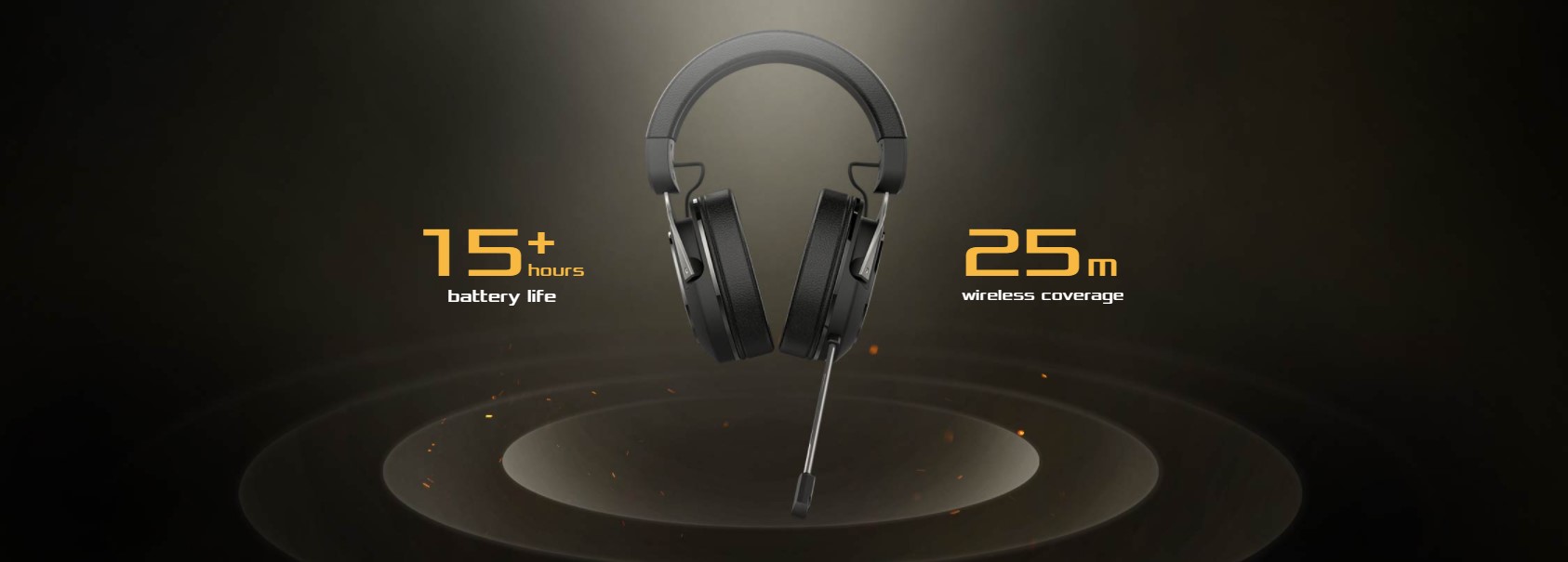 Durata extinsă de viață a bateriei căștilor TUF Gaming H3 Wireless permite gamerilor obișnuiți să se bucure cel puțin 8 zile1 de jocuri sau muzică la o singură încărcare, iar gamerii hardcore se pot bucura de peste 15 ore2 de acțiune nonstop. În plus, acoperirea îmbunătățită pe o rază de până la 25 de metri îți permite să te deplasezi liber fără a pierde semnalul audio.