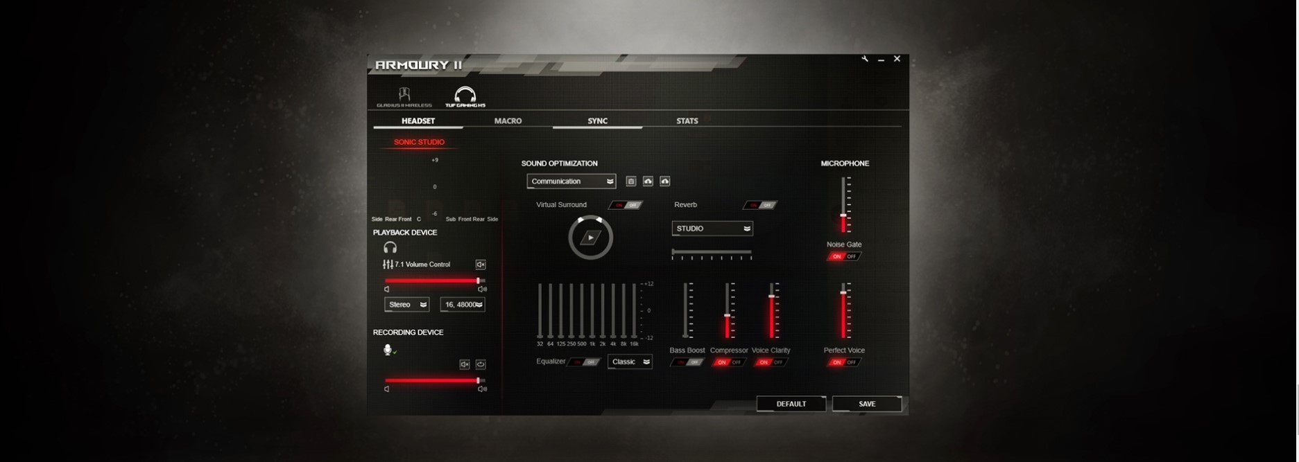 Armoury II este un software care vă oferă control extins și o interfața intuitivă, astfel încât puteți ajusta cu ușurință căștile TUF Gaming H5 pentru a vă putea juca în stilul propriu1. Aveți controlul complet al experienței dvs. audio, de la egalizator (EQ) la nivelul de balansare al difuzoarelor 7.12, și chiar creați și aplicați cu ușurință profile audio pentru diferite jocuri și scenarii, cum ar fi jocurile de curse sau FPS-urile.
