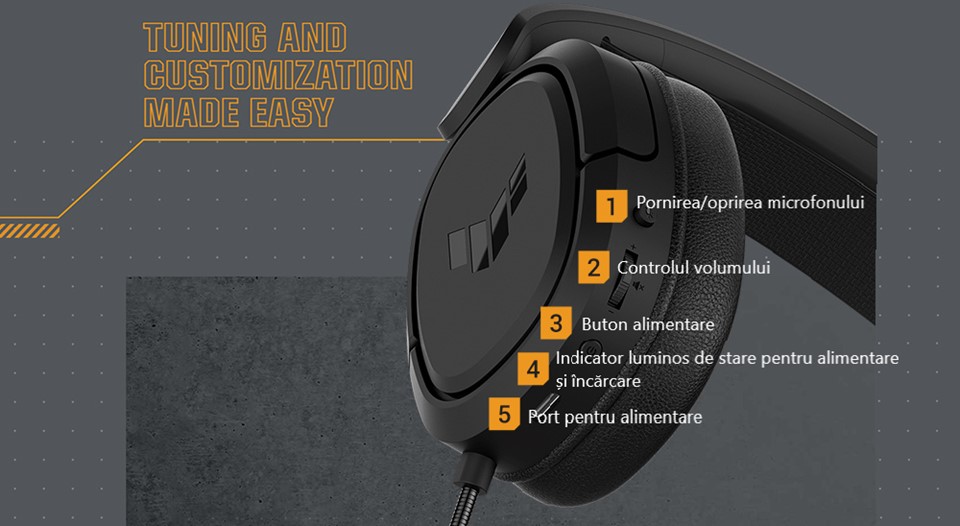 Butoanele de control practice și intuitive de pe cupa pentru ureche facilitează ajustarea volumului, dezactivarea sau dezactivarea microfonului.