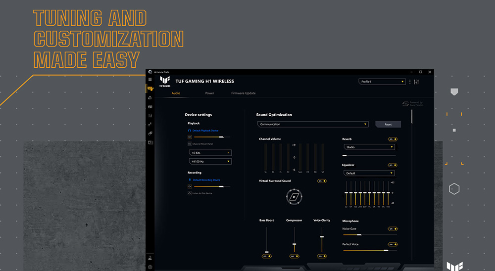Armoury Crate este un utilitar software conceput pentru a-ți oferi un control centralizat al produselor de gaming acceptate, facilitând adaptarea TUF Gaming H1 Wireless la preferințele tale individuale. Armoury Crate îți permite să personalizezi profilurile utilizatorilor, să optimizezi sunetul, să verifici starea bateriei în timpul jocului și multe altele.