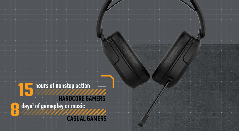 Autonomia extinsă a bateriei oferită de TUF Gaming H1 Wireless permite 8 zile* de joc normal sau de ascultare a muzicii cu o singură încărcare sau până la 15 ore** de acțiune neîntreruptă pentru jucătorii înfocați.