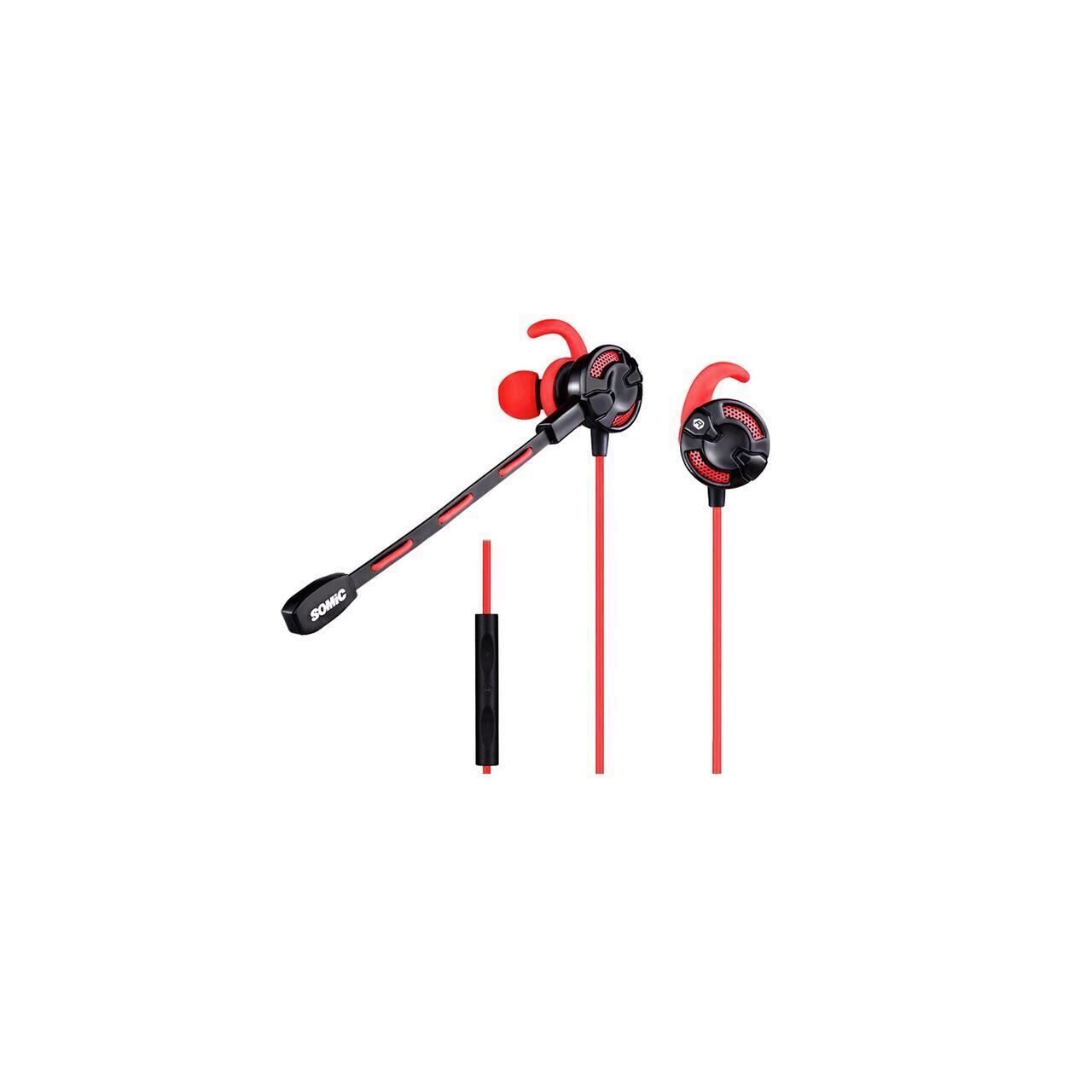 Somic G618 Red Gaming Earphone, include 3 perechi de dopuri pentru urechi din silicon de diferite marimi, include etui pentru transport, microfon omnidirectional detasabil (dimensiuni: ∅4.0x1.5mm, sensibilitate: -42dB±3dB (la 1KHz), impedanta: ≤2.2KΩ), difuzoare: 10.0mm (impedanta: 16Ω, frecventa raspuns: 20Hz-20KHz, sensibilitate (S.P.L): 100dB±3dB (la 1KHz)), lungime cablu: 1.2m, conectori: 1x jack TRRS 3.5mm placat cu aur, adaptor pentru conectarea la calculator , greutate: 35g