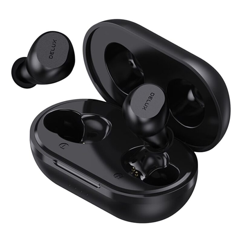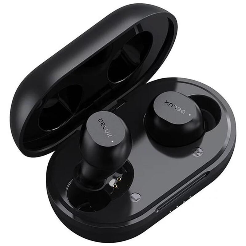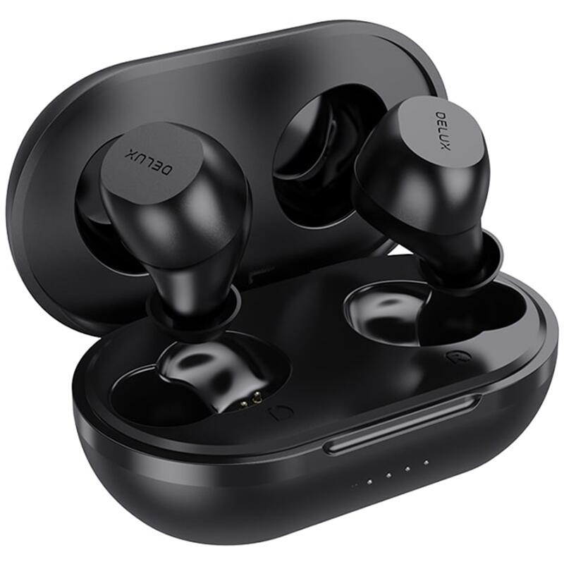Casti wireless in ear Delux DT3 negre, tip: In-Ear, protectie IPX5, protocol wireless: Bluetooth 5.0, protocol: A2DP/HSP/HFP/AVRCP, autonomie: aproximativ 6 ore, timp de incarcare: pe fir 1.5 ore / wireless 2.5 ore, control tactil, Low Latency, dimensiune difuzor: 6mm, includ microfon (MEMS 2718), acumulator: cutie incarcare: 500mAh LiPo / casca: 45mAh LiPo, conectori incarcator: USB Type-C