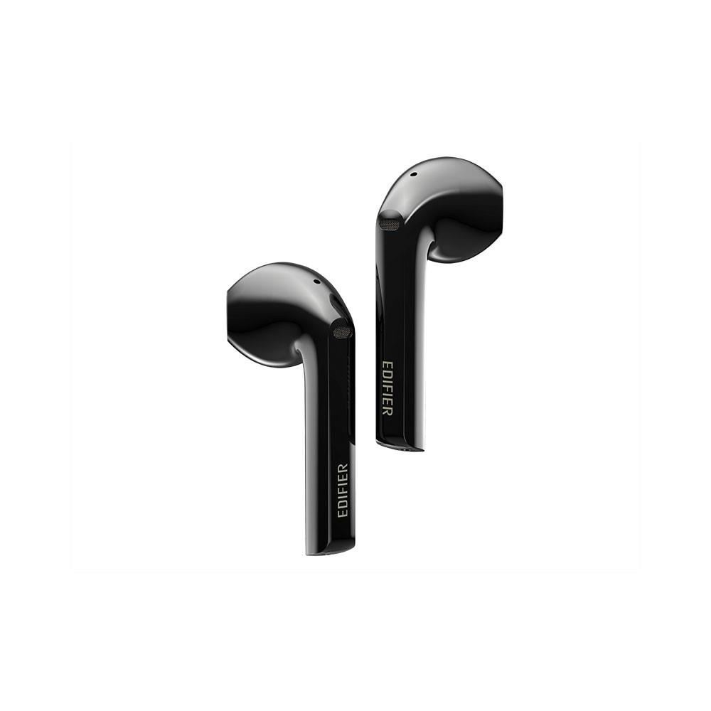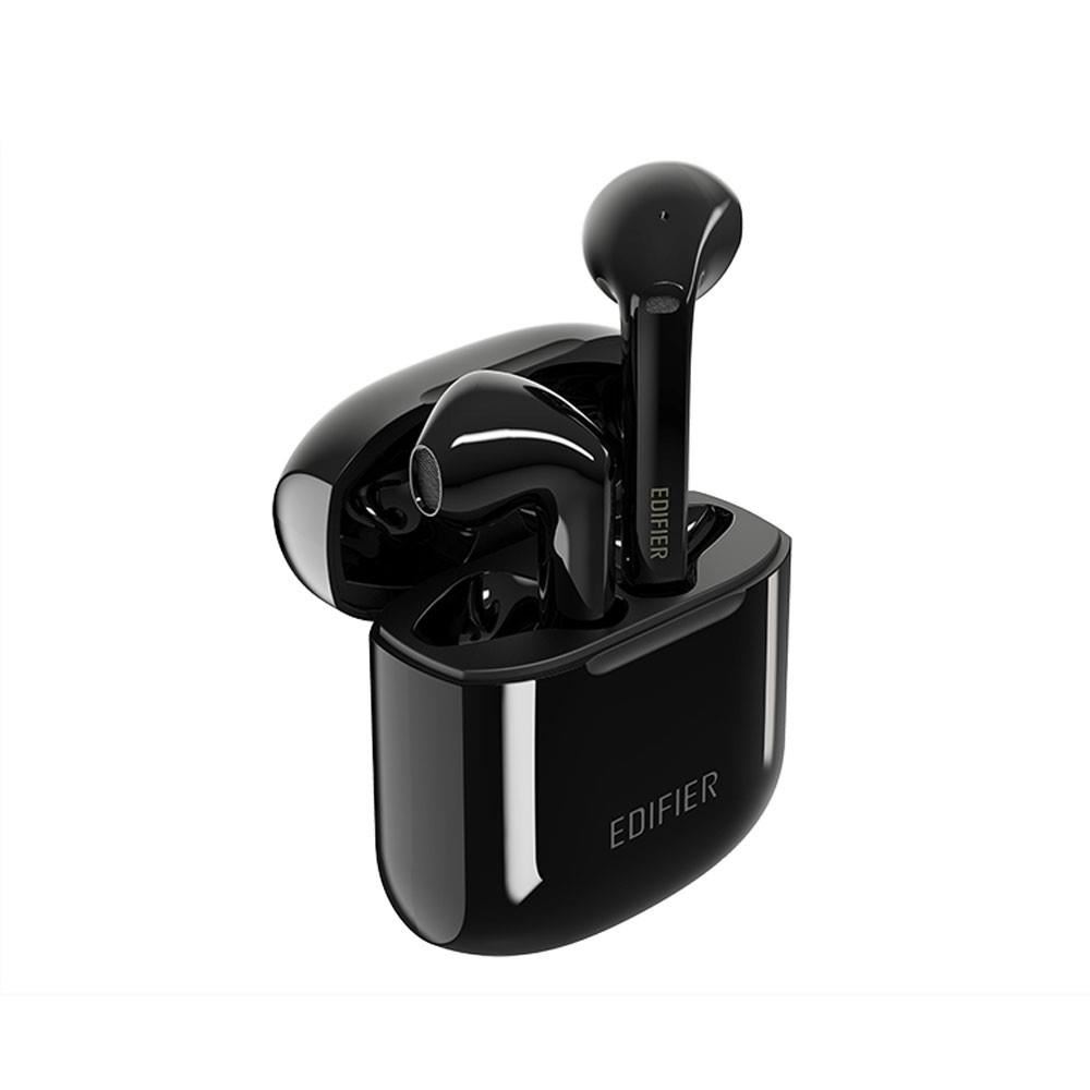 Casti wireless in ear Edifier TWS200 negre, protocol wireless: Bluetooth 5.0, IPX4, decaodare aptX, difuzoare: 13mm (frecventa in raspuns:20 Hz - 20 kHz), sistem de microfoane duale pentru Noise Canceling, autonomie: aproximativ 6 ore, include microfon, cutie pentru depozitre si cu rol de incarcator, conectori: microUSB