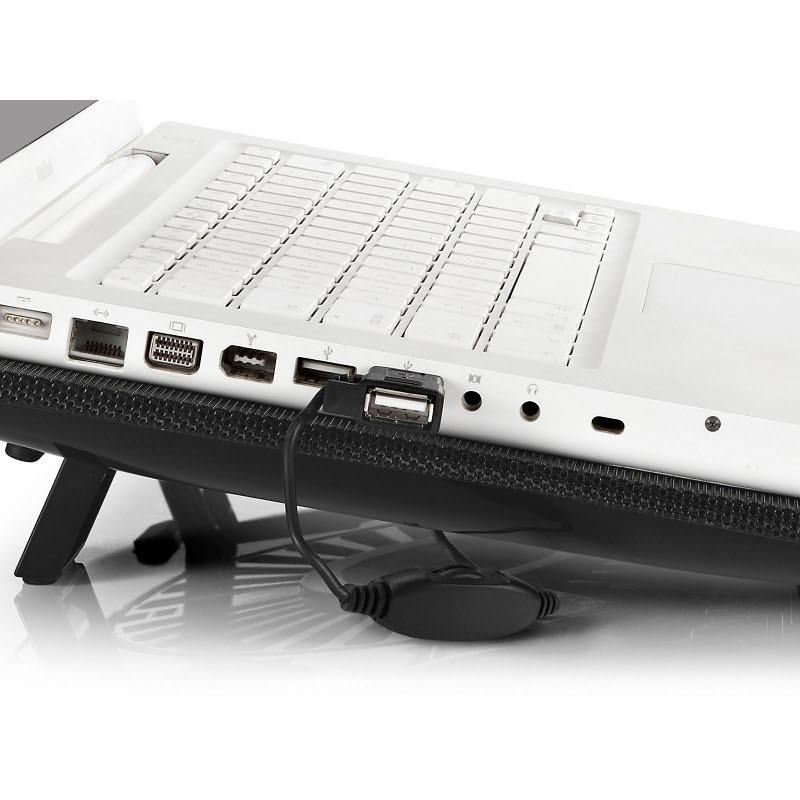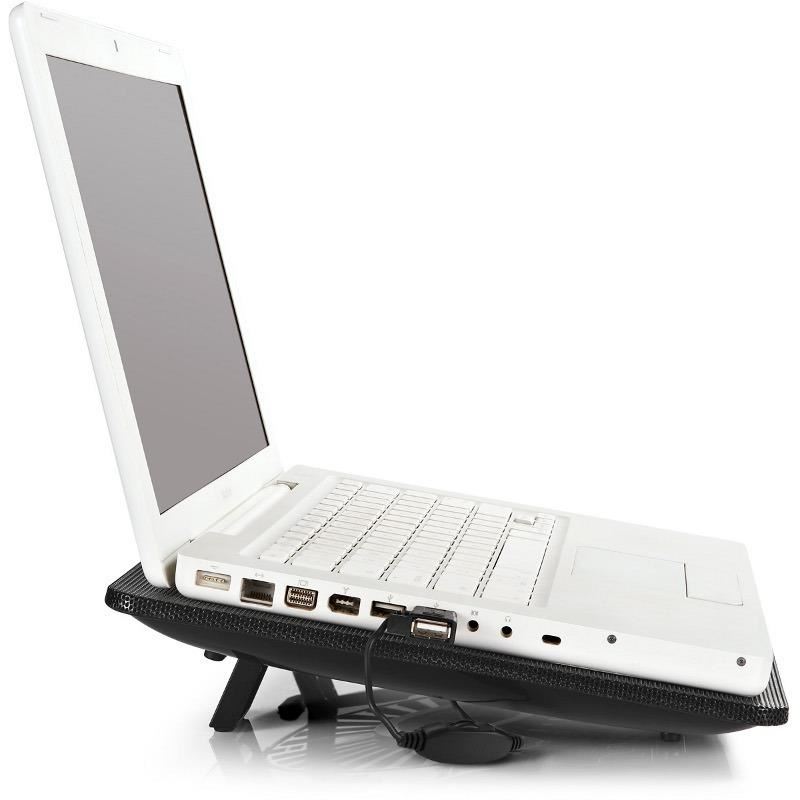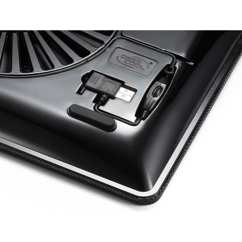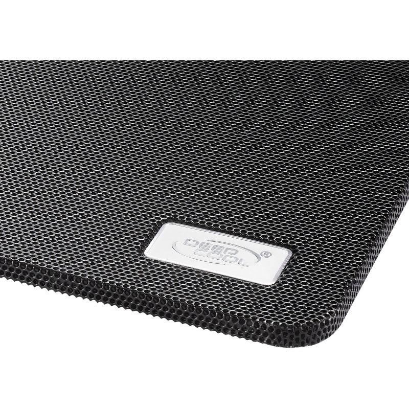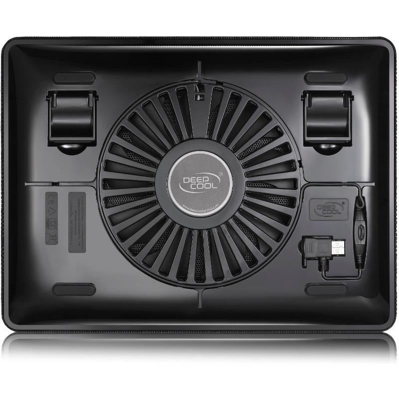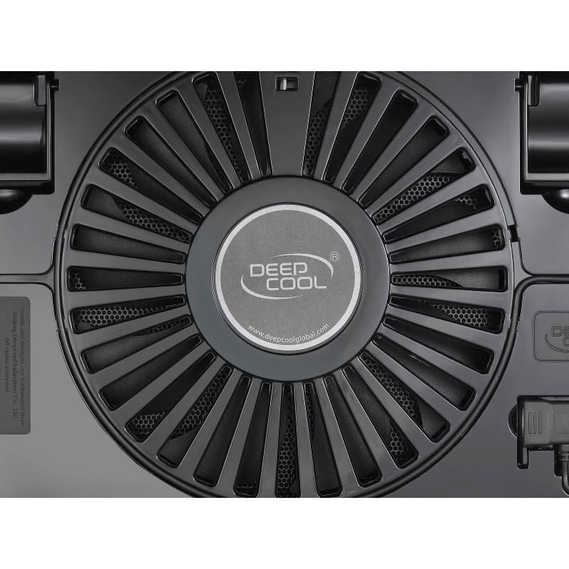 Deepcool N1 Black, structura din plastic si mesh metalic, dimensiune notebook: 15.6” (maxim), 180mm fan (600-1000 RPM, 84.7 CFM, 16-20 dBA, control turatie ventilatoare), alimentare prin portul USB, design anti-alunecare, dimensiuni: 350x260x26mm