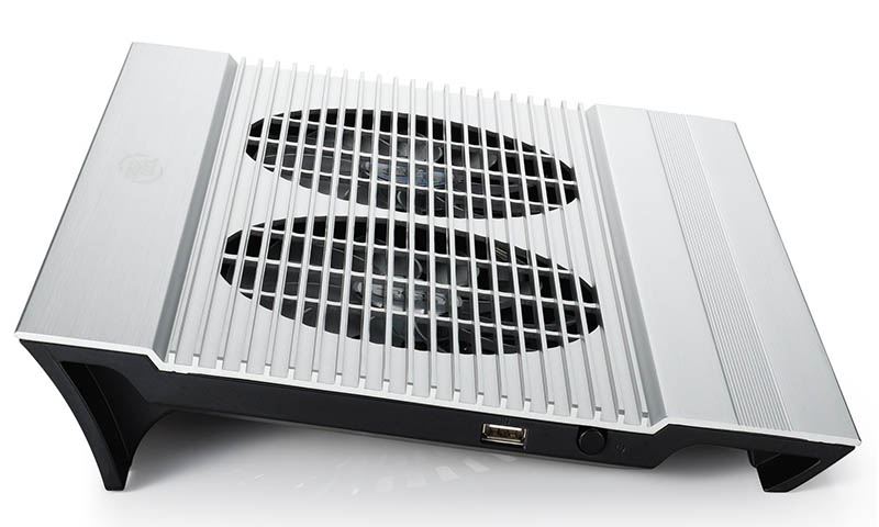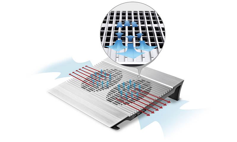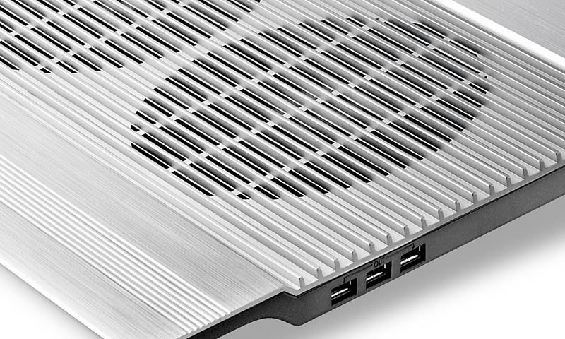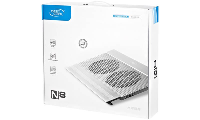 Deepcool N8, structura din aluminiu si plastic, dimensiune notebook: 17” (maxim), dual 140mm fans (1000 RPM, 94.7 CFM, 25.1 dBA), 4 porturi USB, dimensiuni: 380x278x55mm