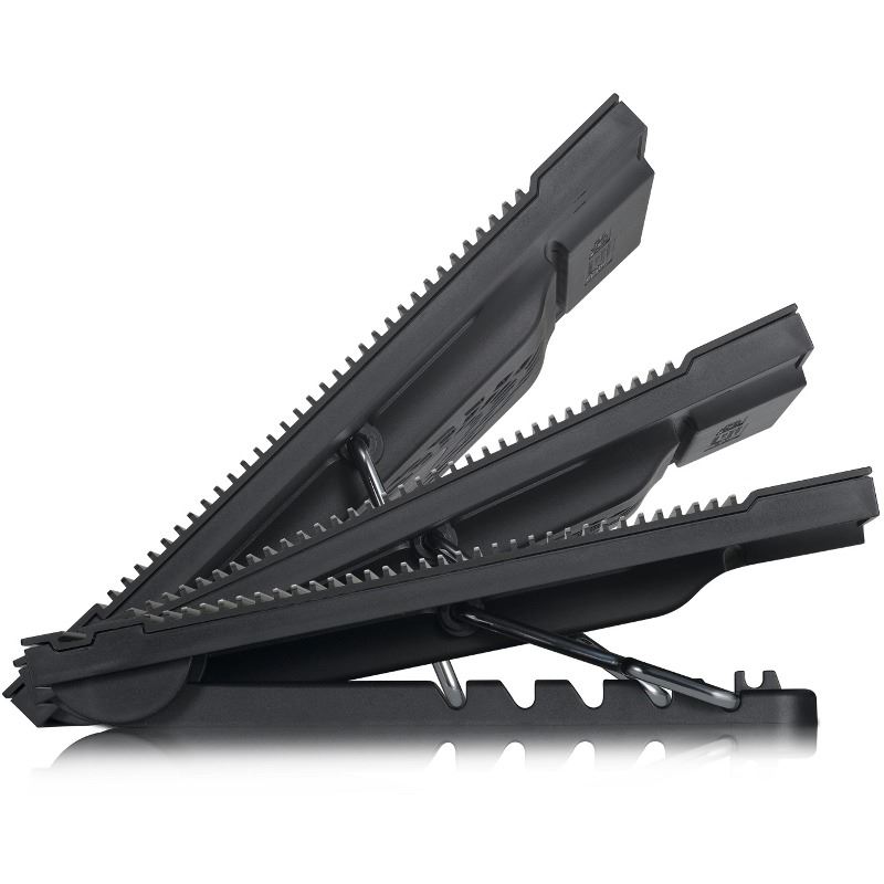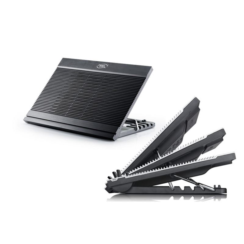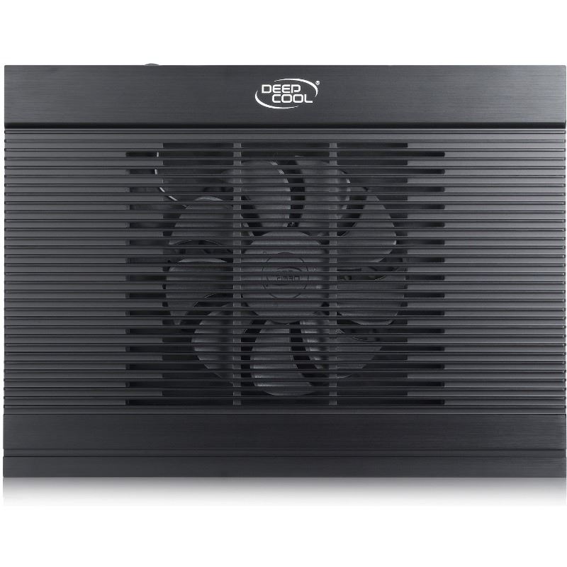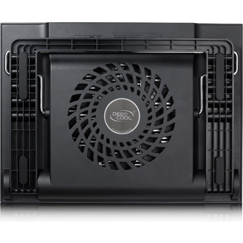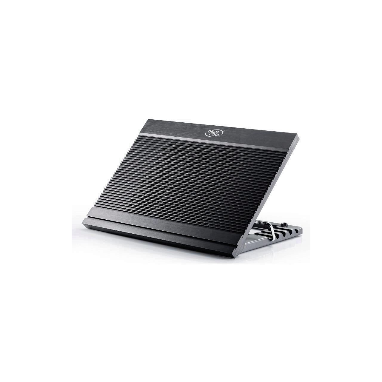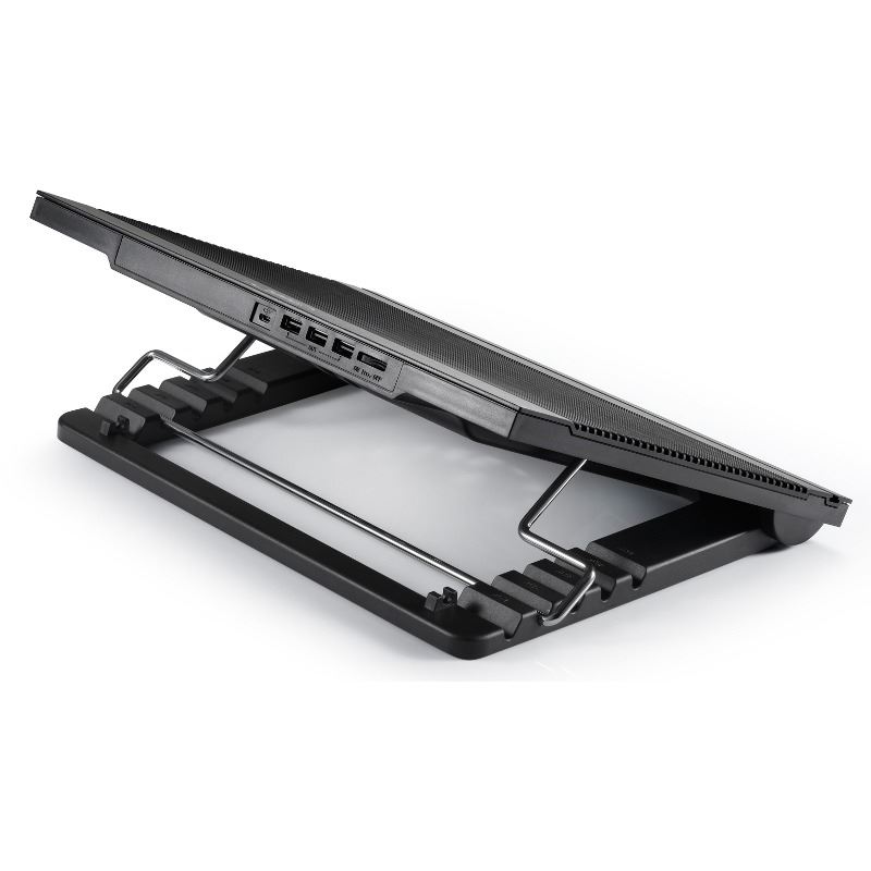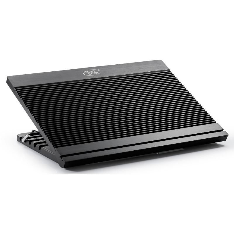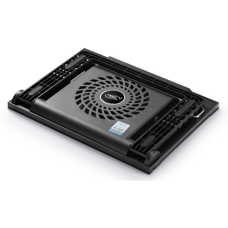 Deepcool N9 Black, structura din aluminiu si plastic, dimensiune notebook: 17” (maxim), 180mm fan (600-1000 RPM, 84.7 CFM, 16-20 dBA, control turatie ventilatoare), 4 porturi USB, alimentare prin portul USB, sase unghiuri de inclinare, design anti-alunecare, dimensiuni: 380x279x34mm