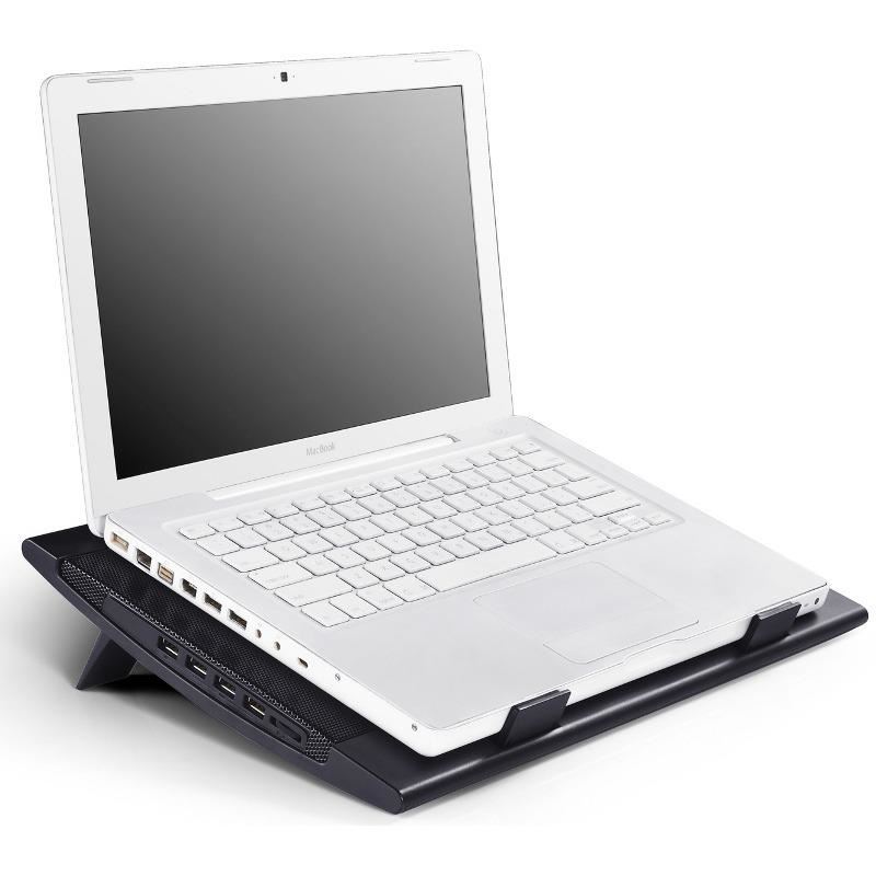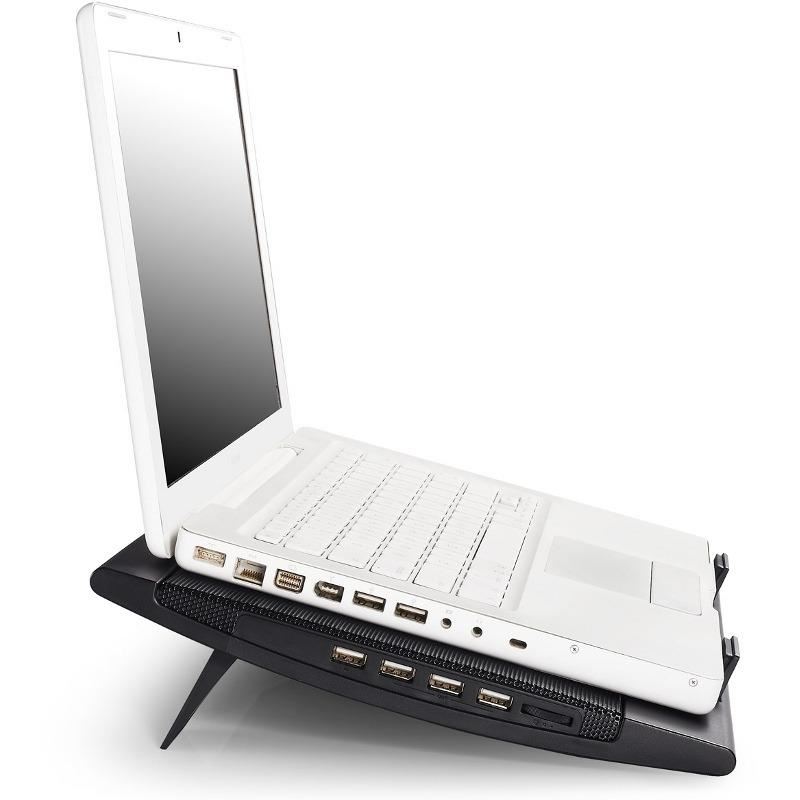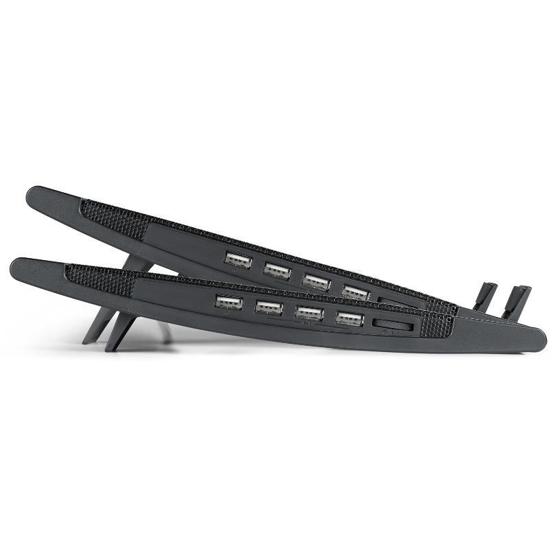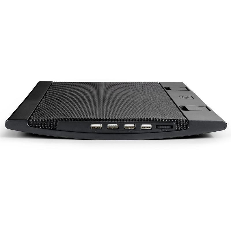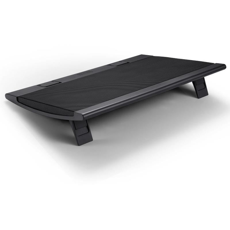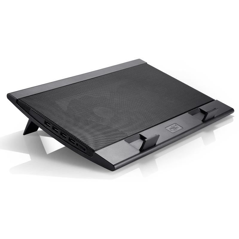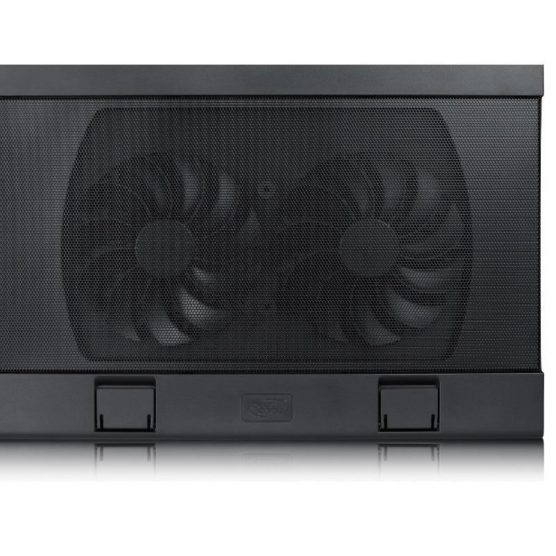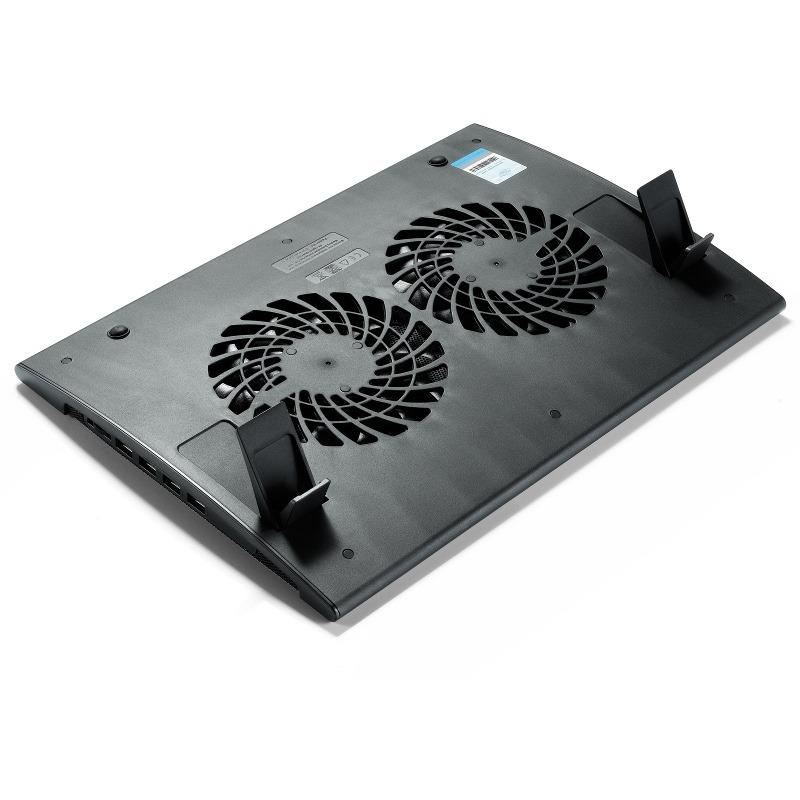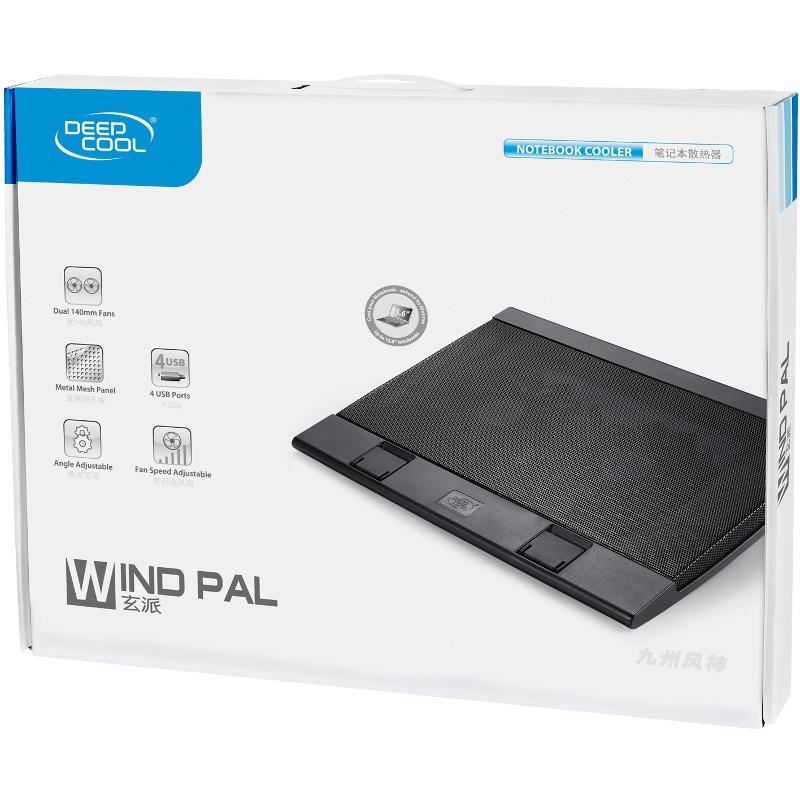 Deepcool Wind Pal, structura din mesh metalic si plastic, dimensiune notebook: 17” (maxim), doua ventilatoare 140mm (700-1200 RPM, 115 CFM, 21.5-26.5 dBA, control turatie ventilatoare), 4 porturi USB, alimentare prin portul USB, doua unghiuri de inclinare, design anti-alunecare, dimensiuni: 382x262x24mm, greutate: 793g