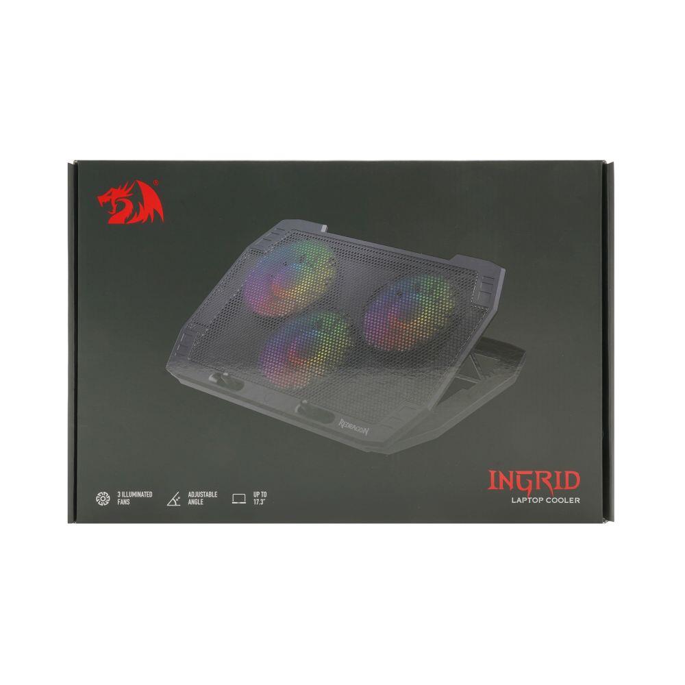 Cooler laptop Redragon Ingrid iluminare RGB, structura din aluminiu si plastic, dimensiune notebook: 17” (maxim), 3 ventilatoare de 120mm (1100 RPM, trei trepte de viteza, 70CFM), alimentare prin portul USB, 7 unghiuri de inclinare, design anti-alunecare, iluminare RGB a ventilatoarelor, buton pentru iluminare si ventilatoare, dimensiuni: 400x270x25mm, greutate: 900g