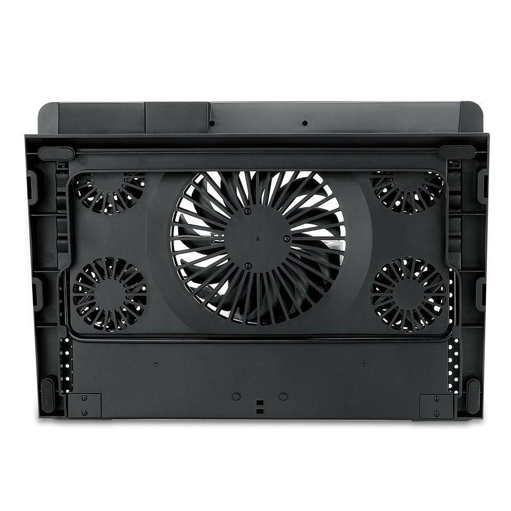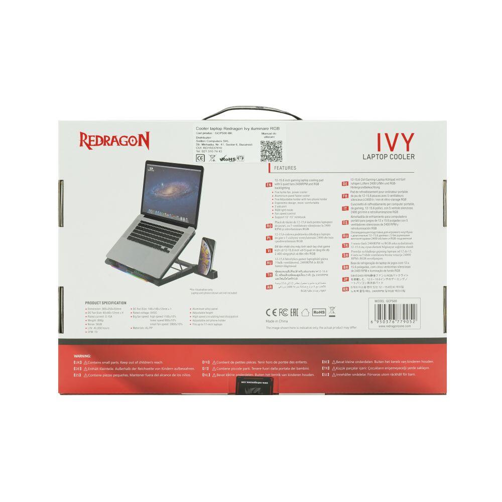 Cooler laptop Redragon Ivy iluminare RGB, structura din aluminiu si plastic, dimensiune notebook: 17” (maxim), 5 ventilatoare: 1x140mm (900-1100 RPM, doua trepte de viteza), 4x 60mm (2800 RPM), 2 porturi USB, alimentare prin portul USB, cinci unghiuri de inclinare, design anti-alunecare, iluminare RGB in partea din fata, suport de telefon ce se poate monta pe ambele laterale, butoane pentru iluminare si ventilatoare, dimensiuni: 360x250x55mm, greutate: 890g