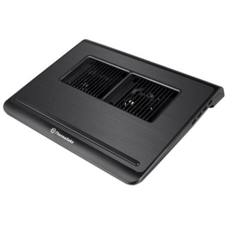 Thermaltake Allways Control, structura din plastic si aluminiu, design ultra-subtire (numai 15mm), design anti-alunecare, dimensiune notebook: 10” - 17” (maxim), doua ventilatoare de 70mm cu fante ajustabile pentru controlul directiei fluxului de aer (1300-2100 RPM, 17.6 CFM, 23.2 dBA, control turatie ventilatoare), 4 porturi USB, alimentare de la portul USB, dimensiuni: 360 x 288 x 53 mm, greutate: 820g