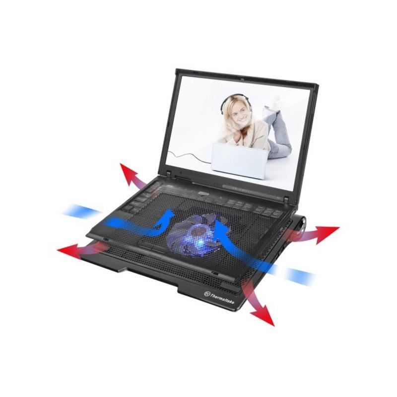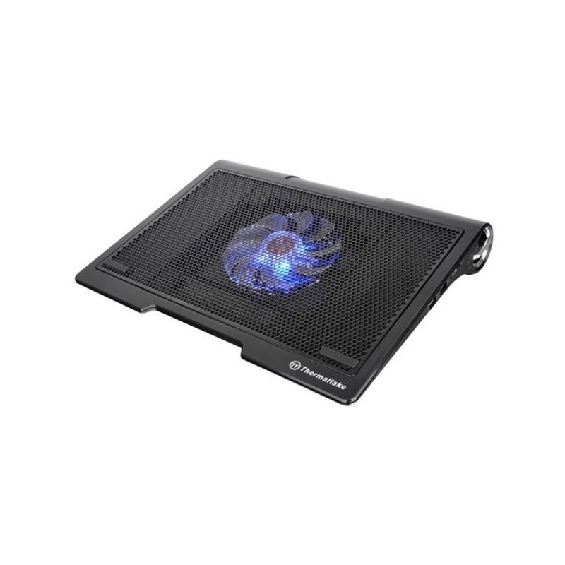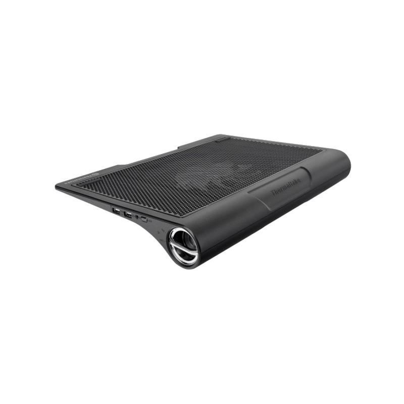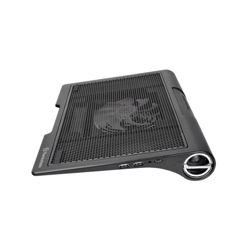 Thermaltake Massive SP, structura din plastic si mesh metalic, dimensiune notebook: 17” (maxim), ventilator silentios de 140mm LED (800-1300 RPM, 54.11 CFM, 1.37 mm-H2O, 29 dBA, control turatie ventilator, buton ON/OFF pentru LED-urile ventilatorului), include 2 boxe stereo, 2 porturi USB, alimentare prin portul USB, design anti-alunecare, dimensiuni: 387 x 282 x 57 mm, greutate: 950g