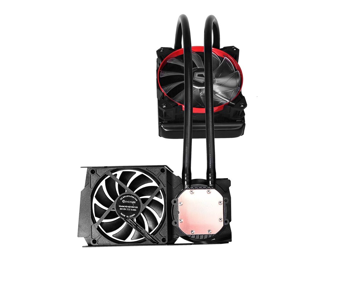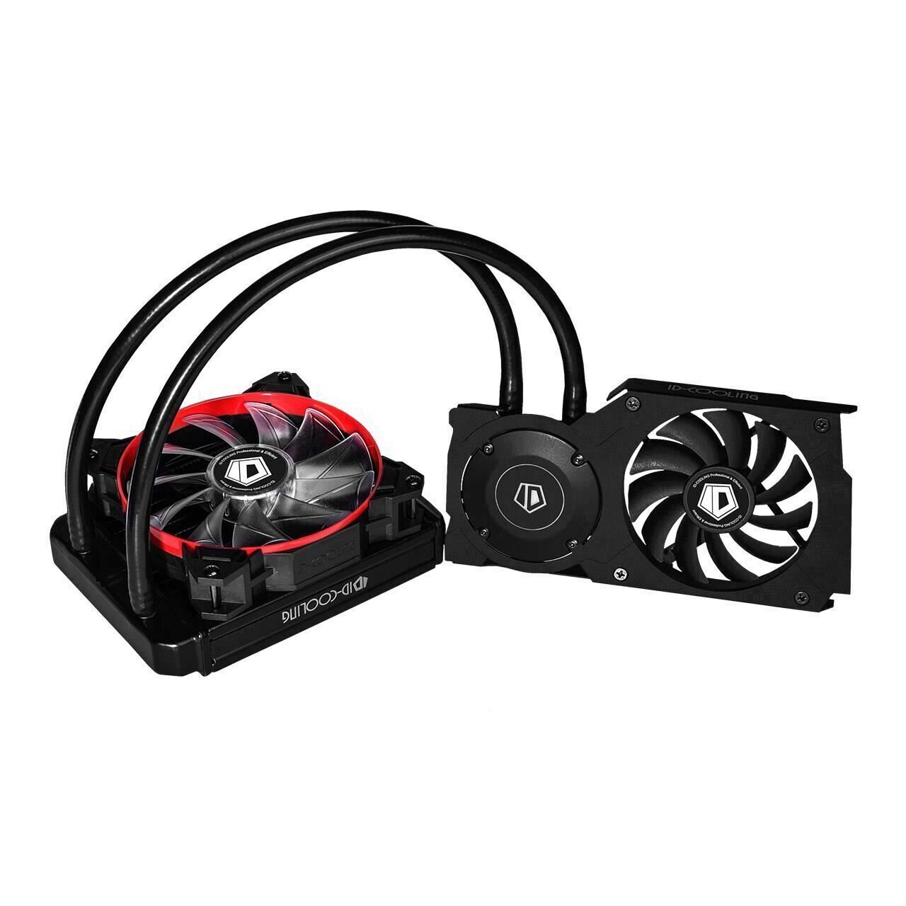ID-Cooling Frostflow 120 VGA, sistem pre-umplut cu lichid, putere de racire de pana la 220W TDP, 1x 120mm Hydraulic Bearing RED fans (700-1500 RPM, 62 CFM, 18-26.4 dBA, 3.2 mmH2O, PWM), 1x 95mm Hydraulic Bearing fan (1500 RPM, 24.5 CFM, 22.8 dBA, 1.25 mmH2O) pompa silentioasa (Ceramic Bearing, 2500 RPM, 25dBA), dimensiuni radiator: 65×32.5mm, lungime tub: 380mm, placi video compatibile: GTX1080/1070/1060/1050/980Ti/980/970/960, etc.; AMD R390/290/280 Series, gauri de montare GPU: 58.4x58.4mm; 53.3x53.3mm