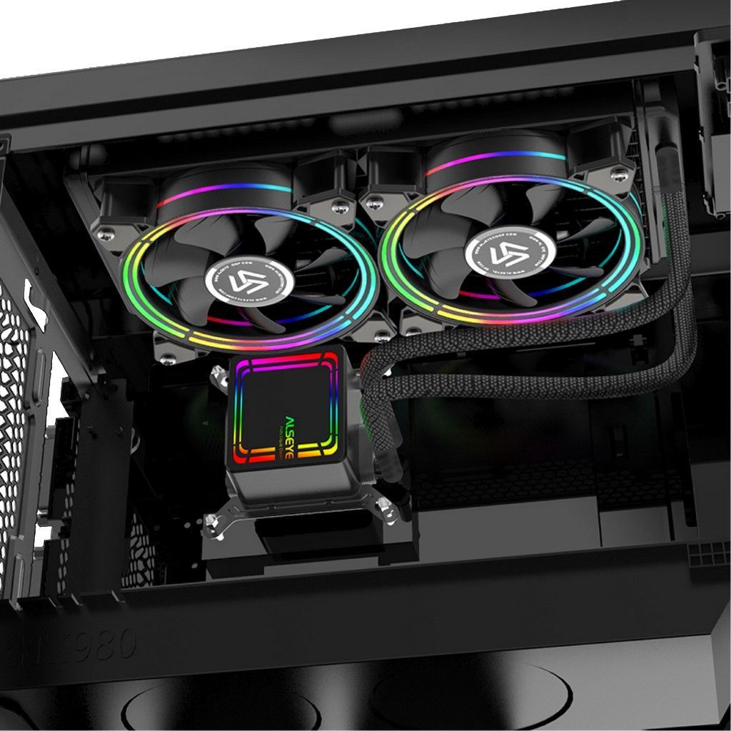 Cooler procesor cu lichid Alseye H240 Halo ilumninare RGB, sistem pre-umplut cu lichid, lungime tuburi: 300mm, putere de racire de pana la 180W TDP, doua ventilatoare RGB 120mm (800-2000 RPM, 31.09-76.80 m³/h, max. 13.5-35.2 dBA, 0.53-1.80 mmH2O, PWM), pompa silentioasa (2600rpm), conector: 1x 4 pin PWM, dimensiuni radiator: 27 x 257 x 120 mm, compatibilitate: Intel LGA775, 1150, 1155, 1151, 1156, 1366, 2011, 2066 Square ILM / AMD AM2, AM2+, AM3, AM3+, AM4, FM1, FM2