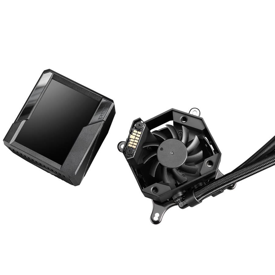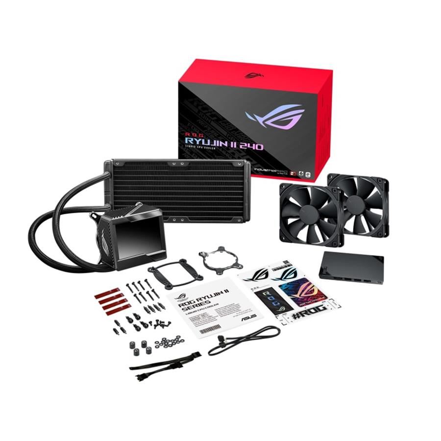 Cooler procesor cu lichid ASUS ROG RYUJIN II 240 cu display, sistem pre-umplut cu lichid, pastila procesorului are integrat un display LCD de 3.5" pe care sunt afisate temparatura, viteza ventilatoarelor, frecvente sau voltaje si un ventilator (4,800 RPM +/- 10%, 3.23 mmH2O, 19.41 CFM), compatibil ASUS Aura Sync, dimensiuni water block: 78x87x81mm, material water block: cupru, doua ventilatoare Noctua NF-F12 InductrialPPC 2000 PWM (450 - 2000 RPM +/- 10%, 71.6 CFM, 29.7 dBA, 121.8 m3h, 3.94 mmH2O, PWM), pompa silentioasa (840-2,800 +/- 300RPM, 20 dBA), dimensiuni radiator: 272x121x27mm, lungime tuburi: 380mm, compatibilitate: AMD AM4, TR4 (pentru socket-ul TR4 bracket-ul de montare se regaseste in cutia procesorului) / Intel LGA115/1366/2011/2011-3/2066/1200/1700