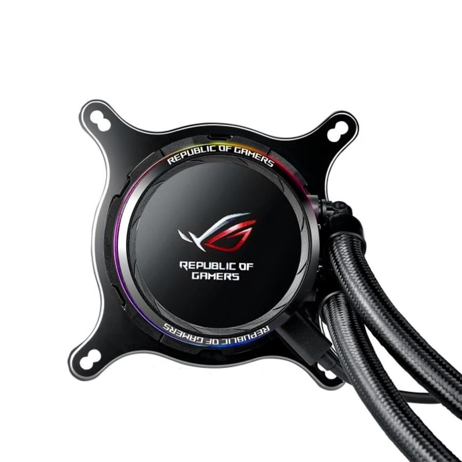Cooler procesor cu lichid ASUS ROG RYUO 120 negru iluminare aRGB, sistem pre-umplut cu lichid, pastila procesorului are integrat un display oLED de 1.77" pe care sunt afisate temparatura, viteza ventilatoarelor, frecvente sau voltaje, compatibil ASUS Aura Sync, dimensiuni water block: 80x80x45mm, material water block: cupru, ventilator 120mm (800 - 2500 RPM +/- 10%, 80.95 CFM, 37.6 dBA, 137.5 m3h, 5.0 mmH2O, PWM), pompa silentioasa (20 dBA), dimensiuni radiator: 150x122x27mm, lungime tuburi: 380mm, compatibilitate: AMD AM4, TR4 (pentru socket-ul TR4 bracket-ul de montare se regaseste in cutia procesorului) / Intel LGA115/1366/2011/2011-3/2066