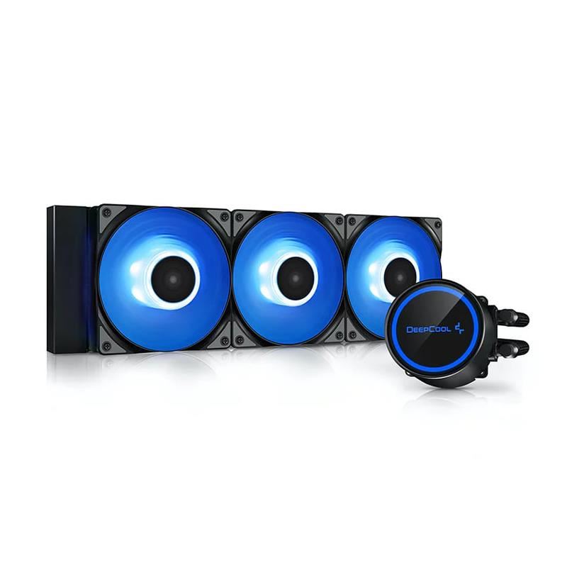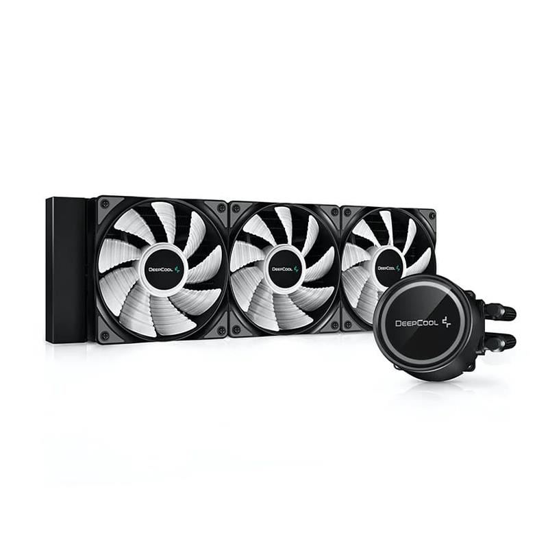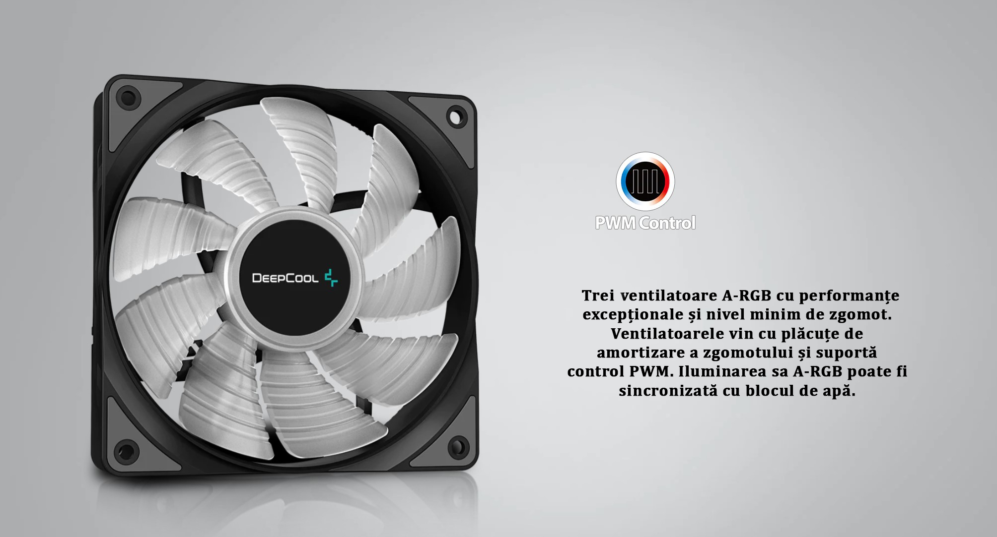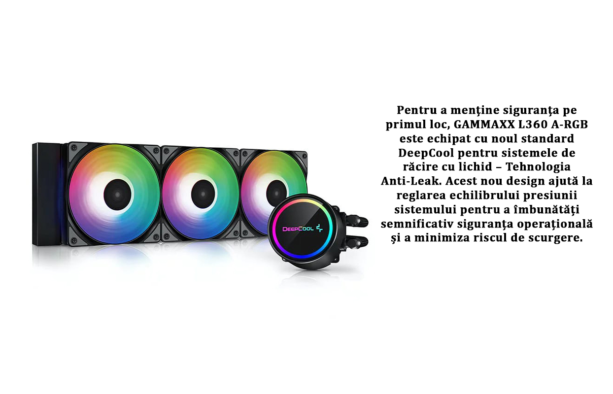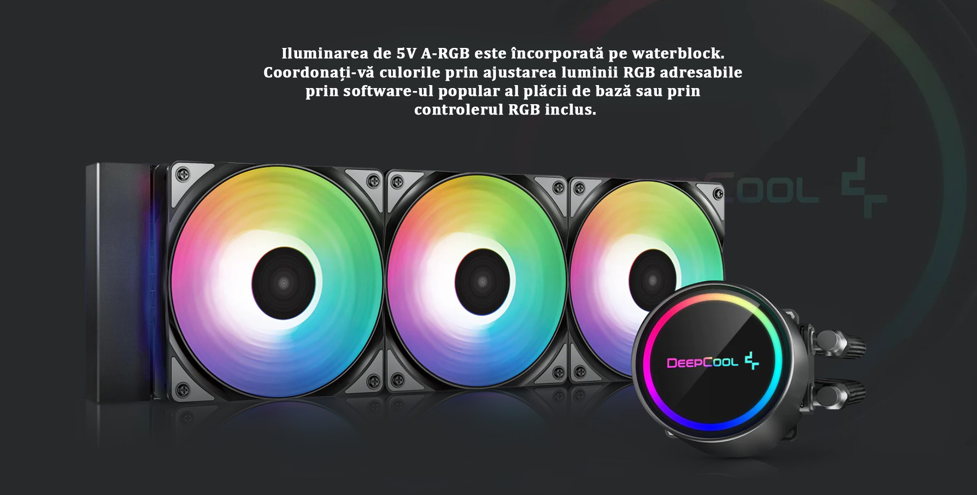 Cooler procesor cu lichid Deepcool Gammaxx L360 iluminare aRGB, sistem pre-umplut cu lichid cu sistem Anti-leak Tech, lungime tuburi: 465mm, trei ventilatoare 120mm Hydro Bearing aRGB (500-1800 RPM±10%, 69.34 CFM, ≤30 dB(A), 2.42 mmH2O, PWM), pompa silentioasa (2400±10% RPM) cu iluminare aRGB, compatibil cu Asrock Polychrome / Asus Aura Sync, compatibilitate: AMD AM4 / Intel TPD 165W LGA2066/2011-v3/2011/1700/1200/1151/1150/1155, dimensiuni radiator: 402x120x27mm, greutate: 1.7kg