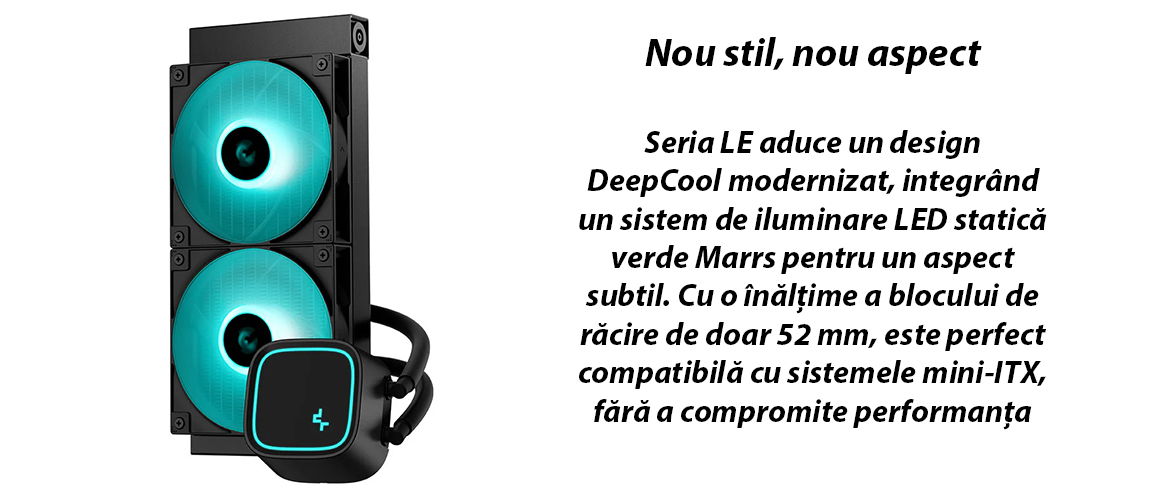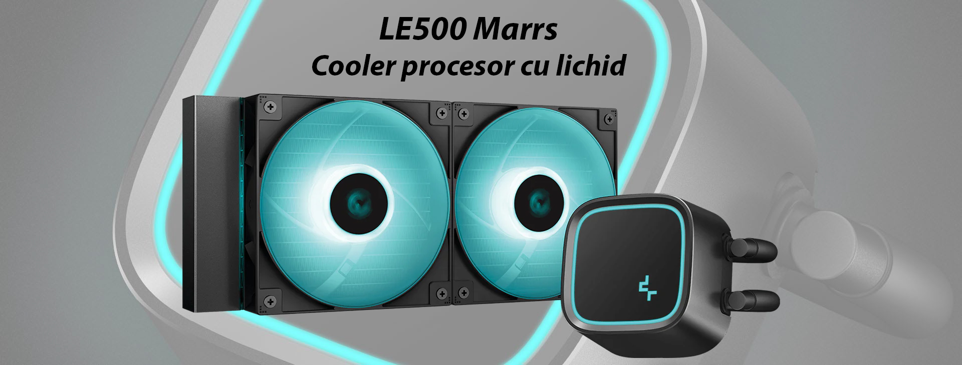 Cooler procesor cu lichid Deepcool LE500 Marrs iluminare verde, sistem pre-umplut cu lichid, lungime tuburi: 415mm, doua ventilatoare 120mm Hydro Bearing green LED (500-2250 RPM, 85.85 CFM, ≤32.9 dBA, 3.27 mmAq, PWM), pompa silentioasa (2400 RPM±10%, 17.8 dB(A)), dimensiuni pompa: 91x80x52mm, dimensiuni radiator: 282x120x27mm, compatibilitate: AMD AM5/AM4 / Intel LGA1700/1200/1151/1150/1155, greutate: 1.24kg