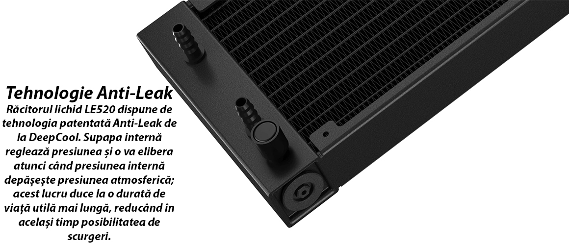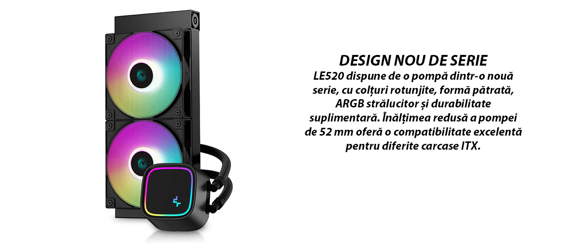 Cooler procesor cu lichid Deepcool LE520 negru iluminare aRGB, sistem pre-umplut cu lichid, lungime tuburi: 410mm, doua ventilatoare 120mm Hydro Bearing aRGB LED (500-2250 RPM, 85.85 CFM, ≤32.9 dBA, 3.27 mmAq, PWM), pompa silentioasa (2400 RPM±10%, 17.8 dB(A)), dimensiuni pompa: 91x80x52mm, dimensiuni radiator: 282x120x27mm, compatibilitate: AMD AM5/AM4 / Intel LGA1700/1200/1151/1150/1155, greutate: 1.23kg