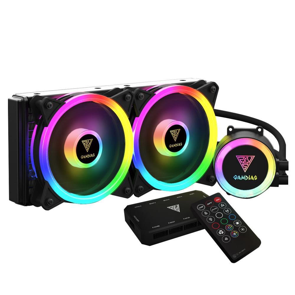 Cooler procesor cu lichid Gamdias Chione M2-240R iluminare RGB, TPD: 200W, sistem pre-umplut cu lichid, doua ventilatoare 120mm Hydraulic aRGB (700 - 2000 RPM±10%, 55 CFM, 16 - 22 dBA, 1.94 mmH2O, PWM), pompa silentioasa cu LED-uri aRGB, dimensiuni radiator: 274x119x27mm, include controller si telecomanda AEOLUS BOX II, sincronizare RGB cu: addressable RGB header (ASUS) / (ASRock), JRAINBOW (MSI) / Digital Pin Header (GIGABYTE) compatibilitate: AMD AM4 / AM3+ / AM3 / AM2+ / AM2 / FM2+ / FM2 / FM1 / TR4 / Intel LGA2066 / 2011-v3 / 2011 / 1151 / 1150 / 1155 / 1156 / 1366 / 775