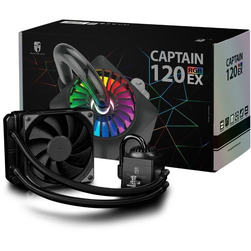 Gamer Storm Captain 120 EX RGB, sistem pre-umplut cu lichid, un ventilator 120mm Hydro Bearing (500-1800 RPM, 153.04 CFM, 17.6-31.3 dBA, 3.31 mmH2O, PWM), pompa silentioasa (2100 RPM), dimensiuni radiator: 154 x 120 x 27mm, lungime tuburi: 310mm, compatibilitate: AMD AM4/AM3+/AM3/AM2+/AM2/FM2+/FM2/FM1 / Intel LGA20XX/LGA1366/LGA115X, banda cu LED-uri RGB cu lungimea de 350mm, compatibil cu Asus Aura Sync, Gigabyte RGB Fusion si MSI Mystic Light Sync