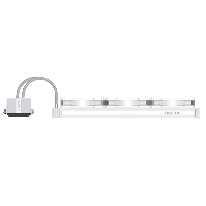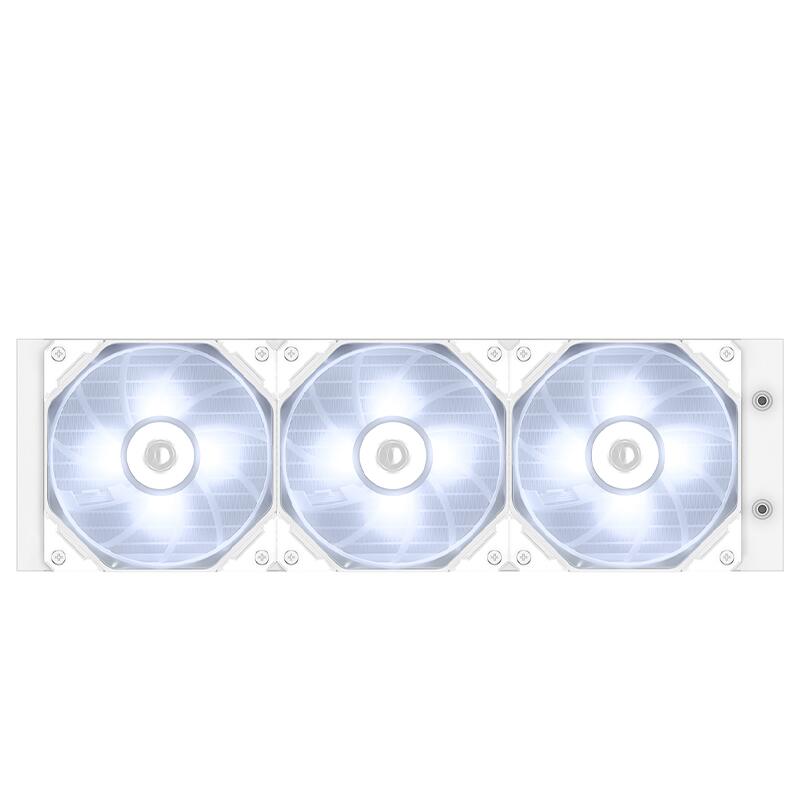 Cooler procesor cu lichid ID-Cooling Dashflow 360 Basic alb, sistem pre-umplut cu lichid, putere de racire de pana la 350W TDP, 3x 120mm Hydraulic Bearing fans (700-1800 RPM, 82.5 CFM, 15.2-35.2 dBA, 2.55 mmH2O, PWM), pompa silentioasa (Ceramic Bearing, 2100 RPM, 25dBA), dimensiune water block: 72x72x54mm, compatibil: Intel LGA2066/2011/1700/1200/1151/1150/1155/1156 si AMD AM5/AM4, dimensiuni radiator: 397x120x27mm, lungime tub: 465mm