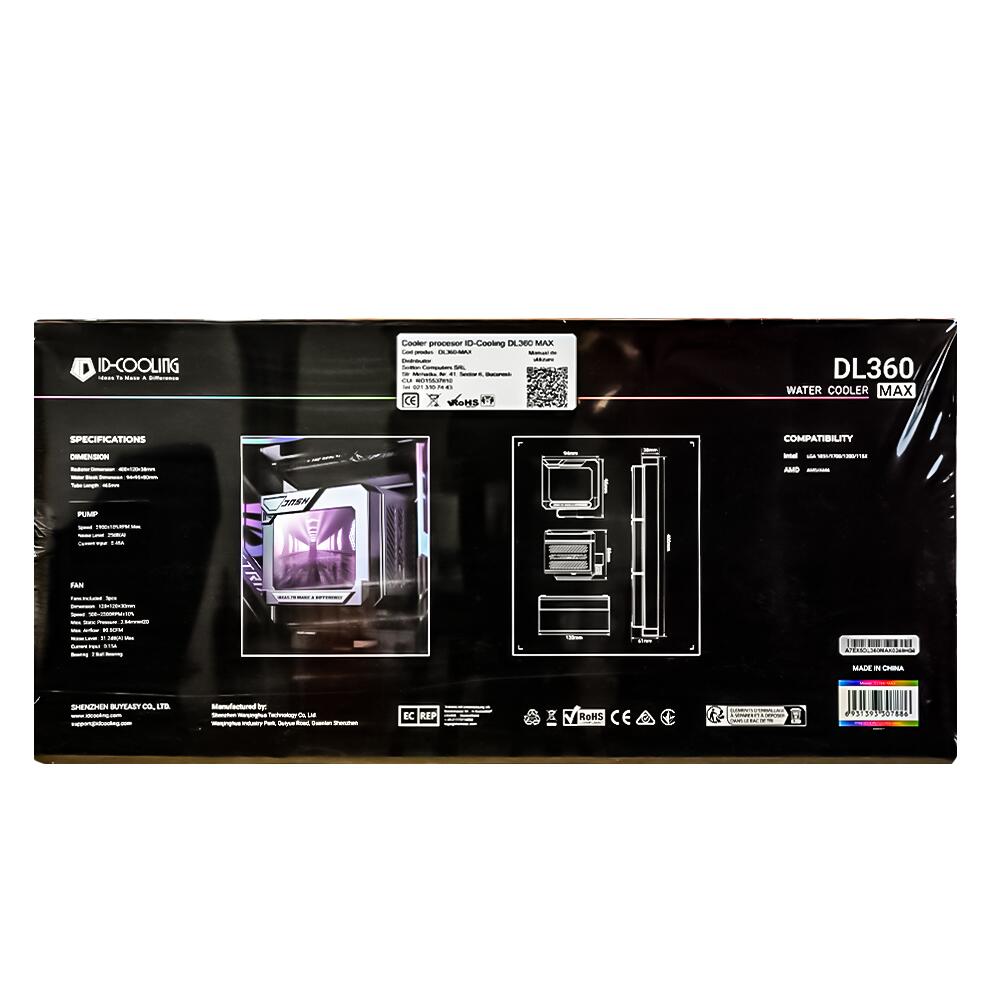 Cooler procesor cu lichid ID-Cooling DL360 MAX cu display iluminare aRGB, sistem pre-umplut cu lichid, putere de racire de pana la 350W TDP, 3x 120mm 2Ball Bearing aRGB fans (500 - 2300±10%RPM, 80.5CFM, 2.84mmH2O, 31.2dB(A), PWM), pompa aRGB silentioasa (Ceramic Bearing, 2900 RPM, 25dBA) cu display (640x480px, 330cd/m², 16.7 milioane de culori, suporta GIF si MP4), dimensiuni waterblock: 94x95x80mm, compatibil: Intel LGA1851/1700/1200/115X si AMD AM4/AM5, dimensiuni radiator: 400×120×38mm, lungime tub: 465mm, compatibil cu Asus Aura Sync / Gigabyte RGB Fusion / ASRock Polychrome Sync / MSI Mystic Light