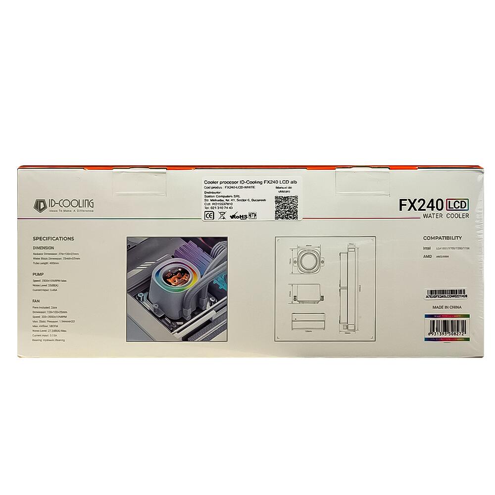 Cooler procesor cu lichid ID-Cooling FX240 LCD alb cu display iluminare aRGB, sistem pre-umplut cu lichid, putere de racire de pana la 300W TDP, 2x 120mm Hydraulic Bearing aRGB fan (300~2000±10%RPM, 58 CFM, 27.2 dBA, 1.94 mmH2O, PWM), pompa silentioasa aRGB (Ceramic Bearing, 2900 RPM, 25dBA) cu display (240x240px, 300cd/m², 262K culori, suporta GIF si MP4), , dimensiuni waterblock: 73x69x57mm, dimensiuni radiator: 276x120x27mm, lungime tub: 400mm, compatibil Intel LGA1851/1700/1200/115X / AMD AM4/AM5, compatibil cu Asus Aura Sync / Gigabyte RGB Fusion / ASRock Polychrome Sync / MSI Mystic Light