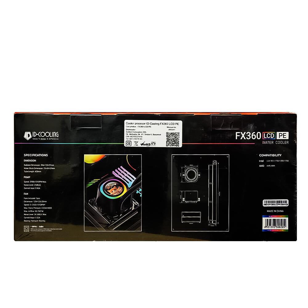 Cooler procesor cu lichid ID-Cooling FX360 LCD PE negru cu display, sistem pre-umplut cu lichid, putere de racire de pana la 350W TDP, 3x 120mm Hydraulic Bearing fan (0~2450±10%RPM, 88.75 CFM, 34.3 dBA, 4.35 mmH2O, PWM), pompa silentioasa aRGB (Ceramic Bearing, 2900 RPM, 25dBA) cu display 1.48 inch (240x240px, 300cd/m², 262K culori, suporta GIF si MP4), , dimensiuni waterblock: 73x69x57mm, dimensiuni radiator: 396x120x27mm, lungime tub: 420mm, compatibil Intel LGA1851/1700/1200/115X / AMD AM4/AM5