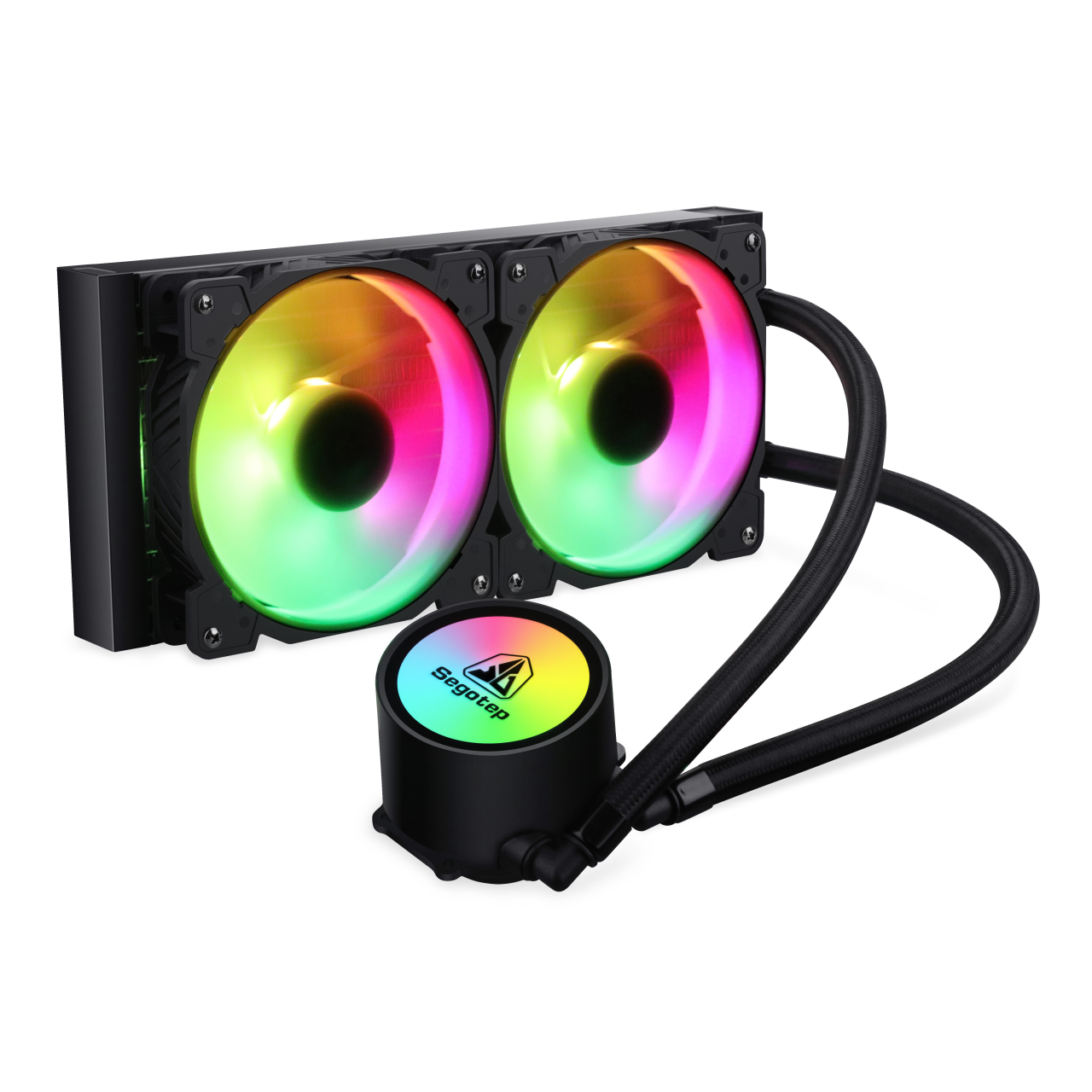Cooler procesor cu lichid Segotep BeIced 240 iluminare aRGB, putere de racire de pana la 200W TPD, sistem pre-umplut cu lichid, 2 ventilatoare de 120mm Hydraulic Mute Bearing (800-1800 RPM, 77.9 CFM, <30.6 dBA), pompa silentioasa (2600rpm), dimensiuni radiator: 277x120x27mm, compatibilitate: AMD AM4/AM3+/AM3/AM2+/AM2/FM2+/FM2/FM1 / Intel LGA1200/2066/2011/1156/1155/1151/1150, conector 4pin alimentare ventilatoare si pompa si 3pin aRGB pentru iluminare
