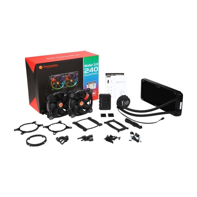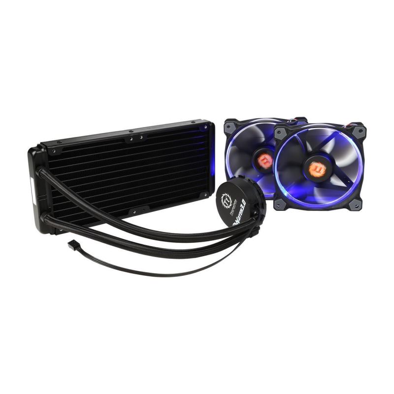 Thermaltake Water 3.0 Riing RGB 240, sistem pre-umplut cu lichid, 2 ventilatoare Riing 12 RGB 120mm (iluminare RGB in 256 culori, include controller pentru iluminarea LED, 800-1500 RPM, 400-1000 RPM in Low Noise Mode, 22.14-40.6 CFM, 18.5-26.4 dBA, 0.57-2.01 mmH2O, PWM), pompa silentioasa, dimensiuni radiator: 270 x 120 x 27 mm, lungime tub: 326mm, compatibilitate: AMD AM2, AM2+, AM3, AM3+, FM1, FM2 / Intel LGA1150, LGA1151, LGA1155, LGA1156, LGA1366, LGA2011, LGA2011-3, greutate: 1071g
