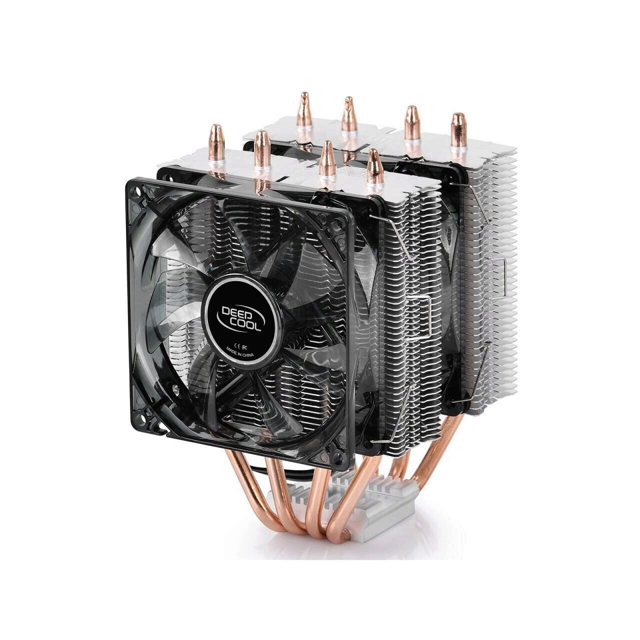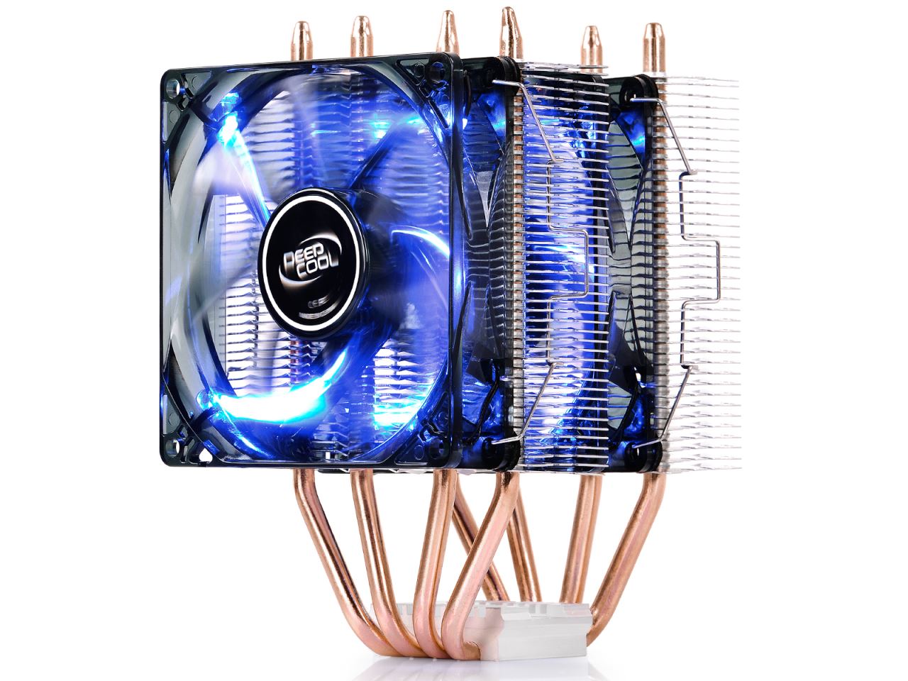 Deepcool Frostwin LED CPU Cooler, 4 heatpipe-uri, 2x 92mm Blue LED Hydro Bearing fans (1600±10%RPM / 900±150~1800±10%RPM, 76.42CFM /80CFM, 17.8-19 dBA, fara PWM / cu PWM), compatibil Intel LGA2011-v3/LGA2011/LGA1366/LGA115X / AMD AM4/AM3+/AM3/AM2+/AM2/FM2+/FM2/FM1, dimensiuni: 102x121x142mm (cu ventilatoare), greutate: 740g