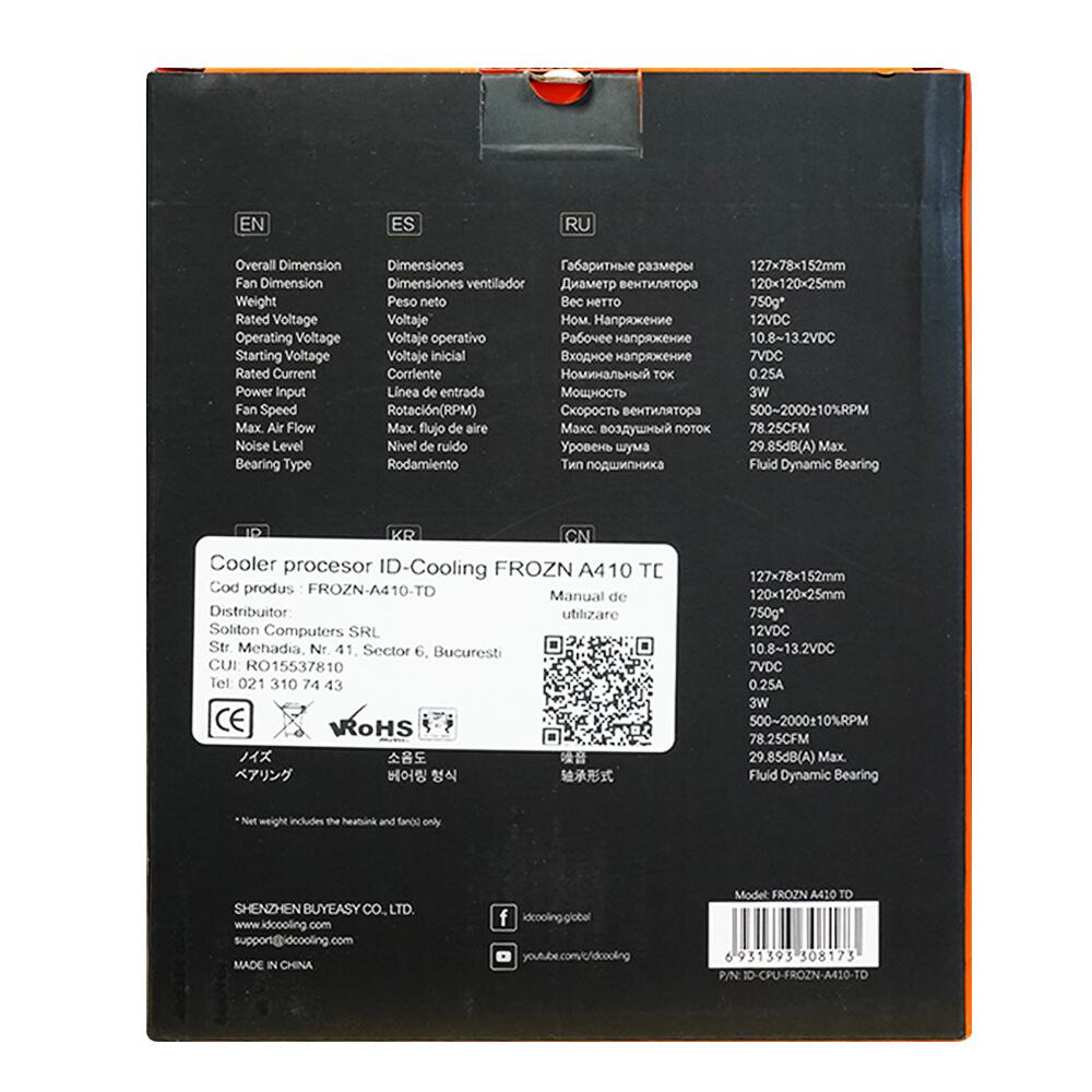 Cooler procesor ID-Cooling FROZN A410 TD cu display, 4 heatpipe-uri din cupru de 6mm, putere de racire de pana la 220W TDP, 1x 120mm Fluid Dynamic Bearing fan (500-2000RPM, 78.25CFM, 2.68 mmH2O, 29.85dB(A), PWM), display ce afiseaza temperatura procesorului, compatibil Intel LGA1851/1700/1200/115X / AMD AM5/AM4, dimensiuni: 120x78x152mm, greutate: 0.75kg