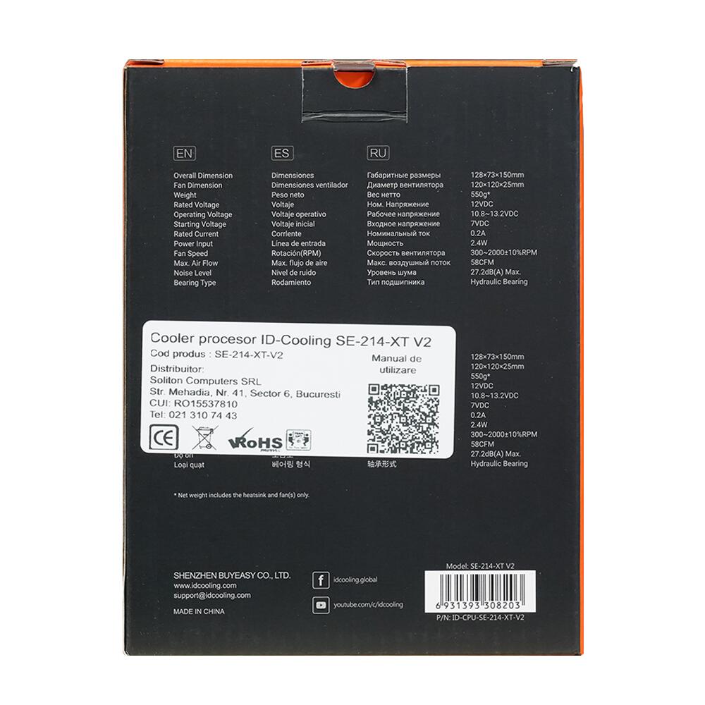Cooler procesor ID-Cooling SE-214-XT V2 iluminare rainbow, 4 heatpipe-uri din cupru direct touch de 6mm, putere de racire de pana la 200W TDP, 1x 120mm Hydraulic Bearing Rainbow LED fan (300~2000±10%RPM, 58 CFM, 1.94mmH2O, 27.2 dBA, PWM), compatibil Intel LGA1851/1700/1200/115X/20XX / AMD AM5/AM4, dimensiuni: 128x73x152mm, greutate: 550g