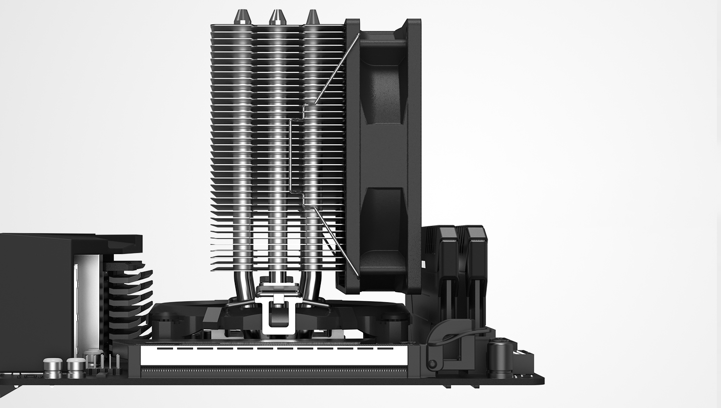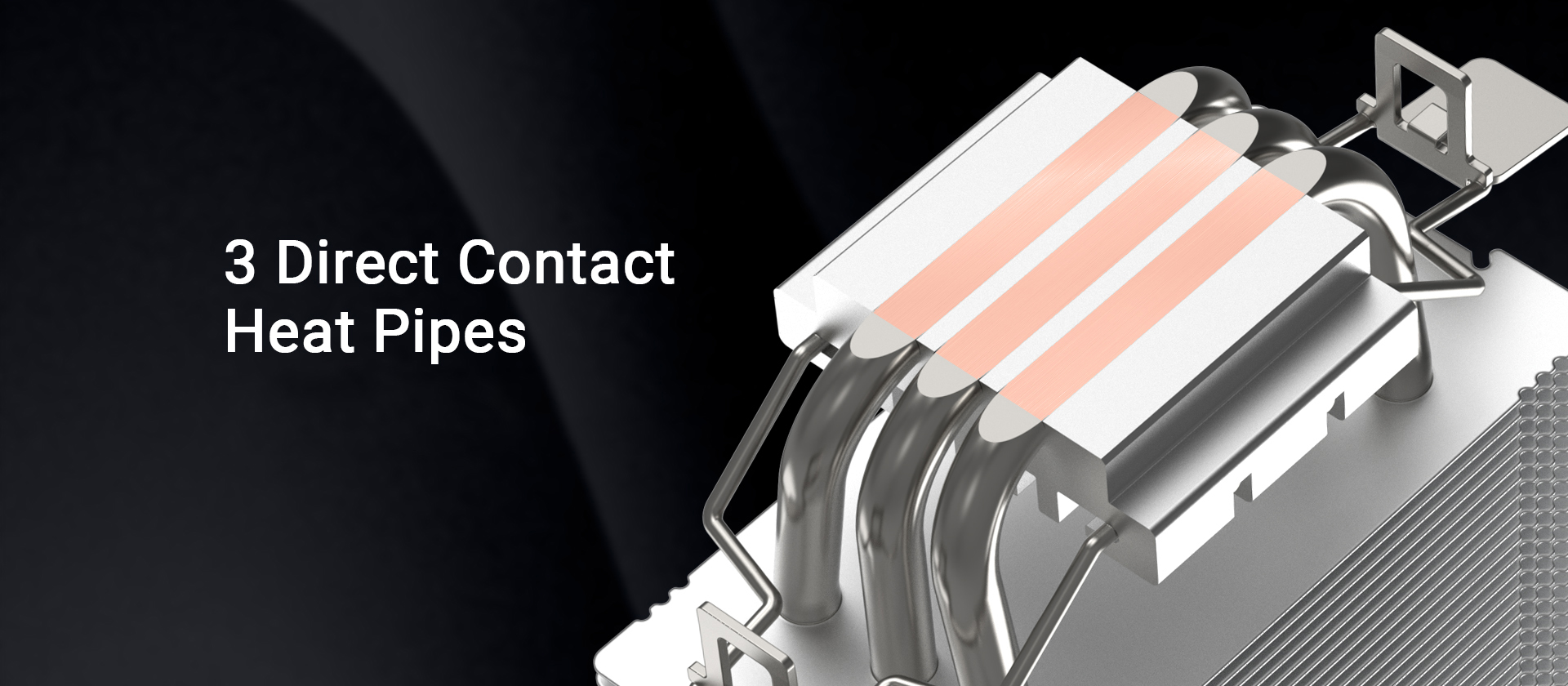 Performanță de răcire: Disipator de căldură cu 3 heatpipe-uri de 6mm cu contact direct pentru o transfer termic eficient și o putere de răcire de până la 130W TDP.