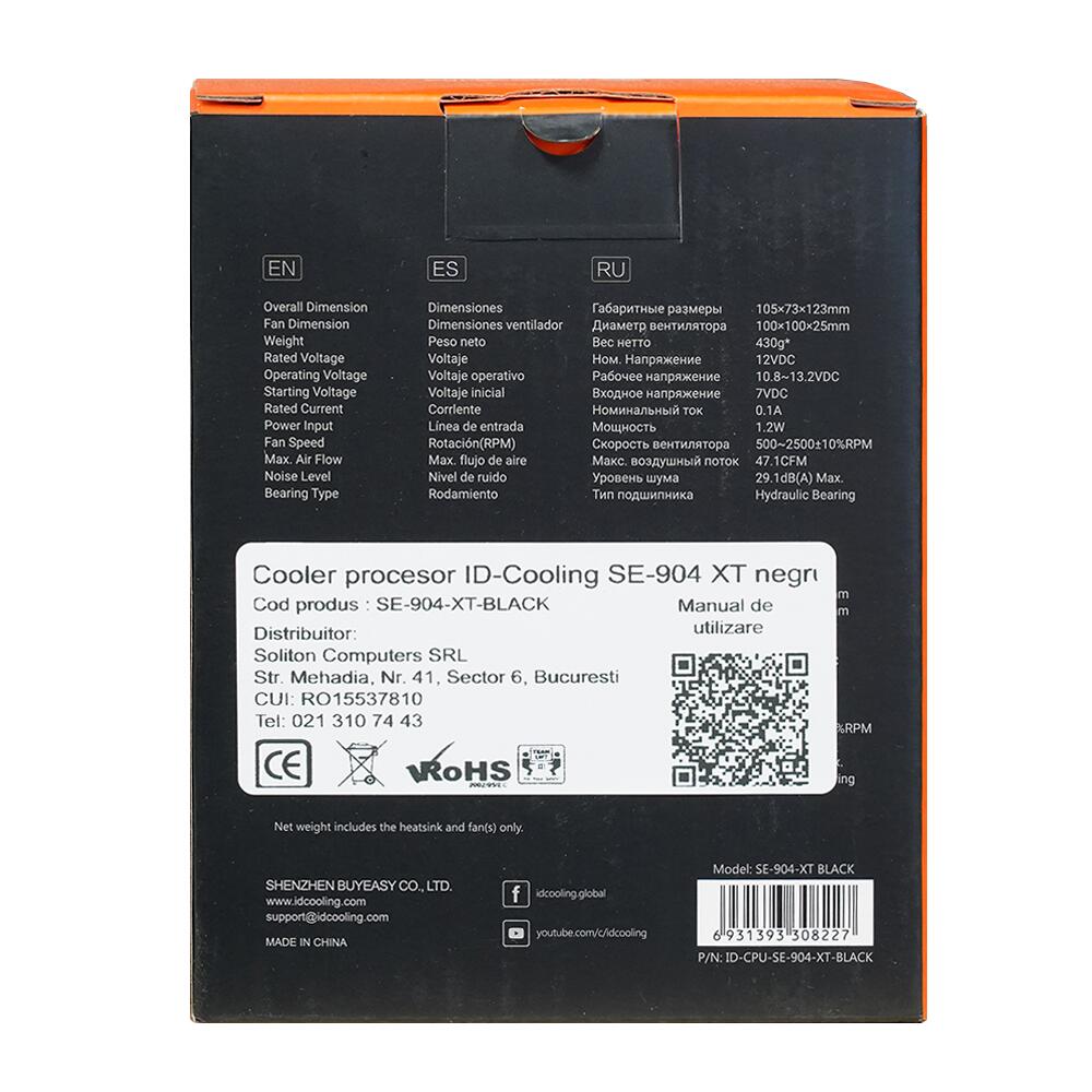 Cooler procesor ID-Cooling SE-904 XT negru, 4 heatpipe-uri direct touch de 6mm, putere de racire de pana la 180W TDP, 1x 100mm Hydraulic Bearing (500-2500 RPM, 47.1 CFM, 29.1 dBA, 1.94mmH2O, PWM), compatibil Intel LGA1851/1700/1200/115X / AMD AM5/AM4, dimensiuni: 105x73x123mm, greutate: 430g
