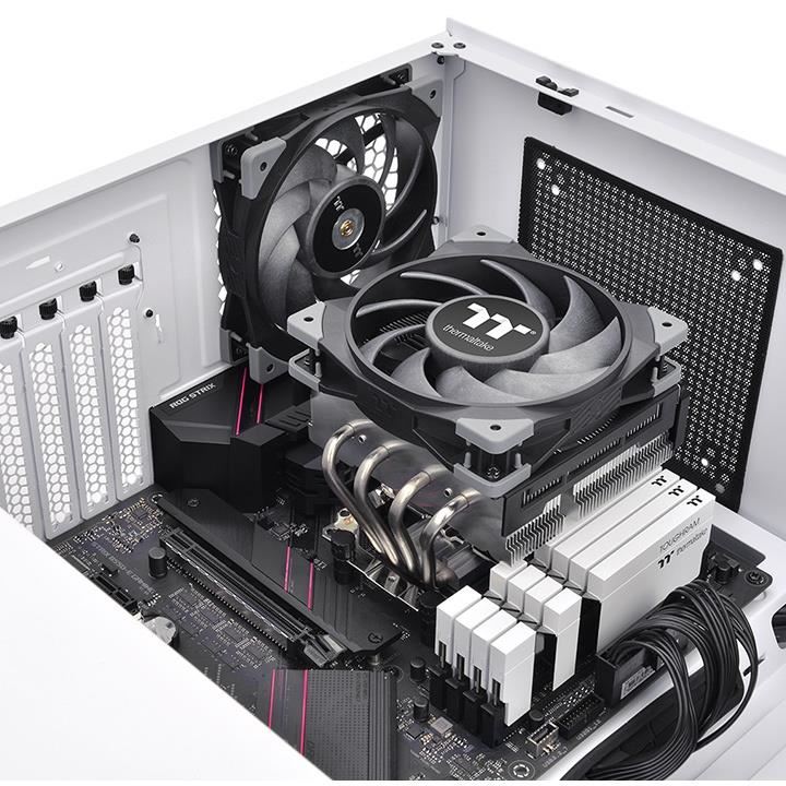 Cooler procesor Thermaltake TT Premium TOUGHAIR 110, 4 heatpipe-uri de 6mm, low profile: inaltime 114.1mm, 120mm fan (500-2000 RPM, 58.35 CFM, 23.6 dBA, 2.41 mm-H2O, PWM), compatibil Intel LGA 1200/1156/1155/1151/1150, AMD AM4/AM3+/AM3/AM2+/AM2/FM2/FM1, dimensiuni: 137.7 x 123.6 x 114.1 mm ( L x W x H), greutate: 0.98kg