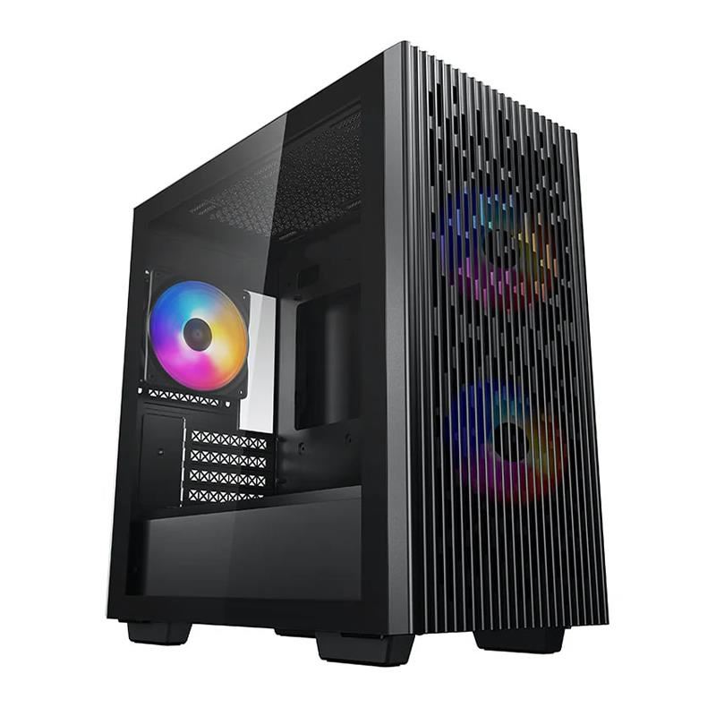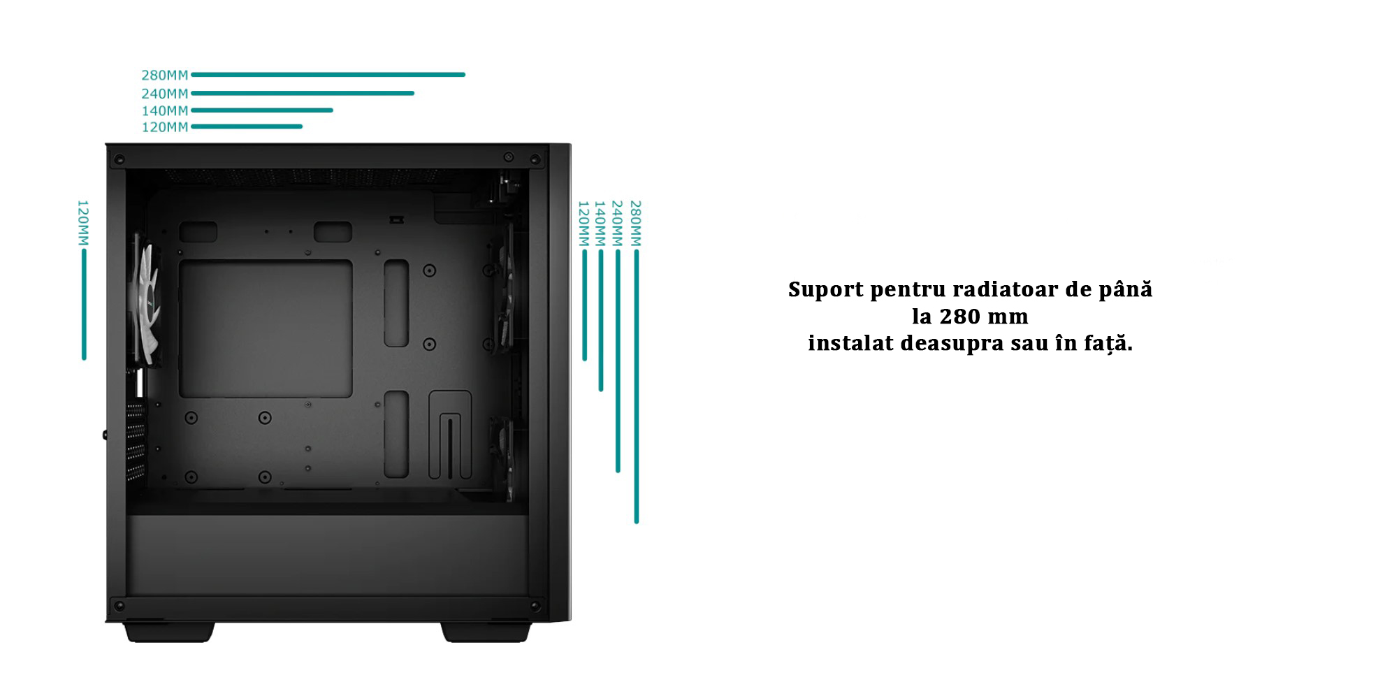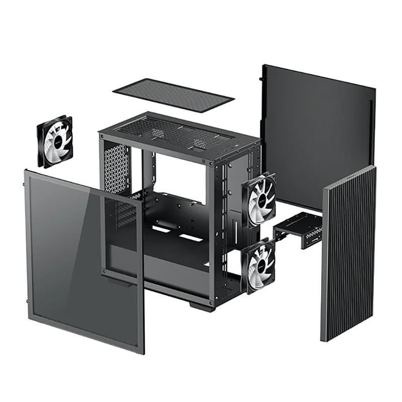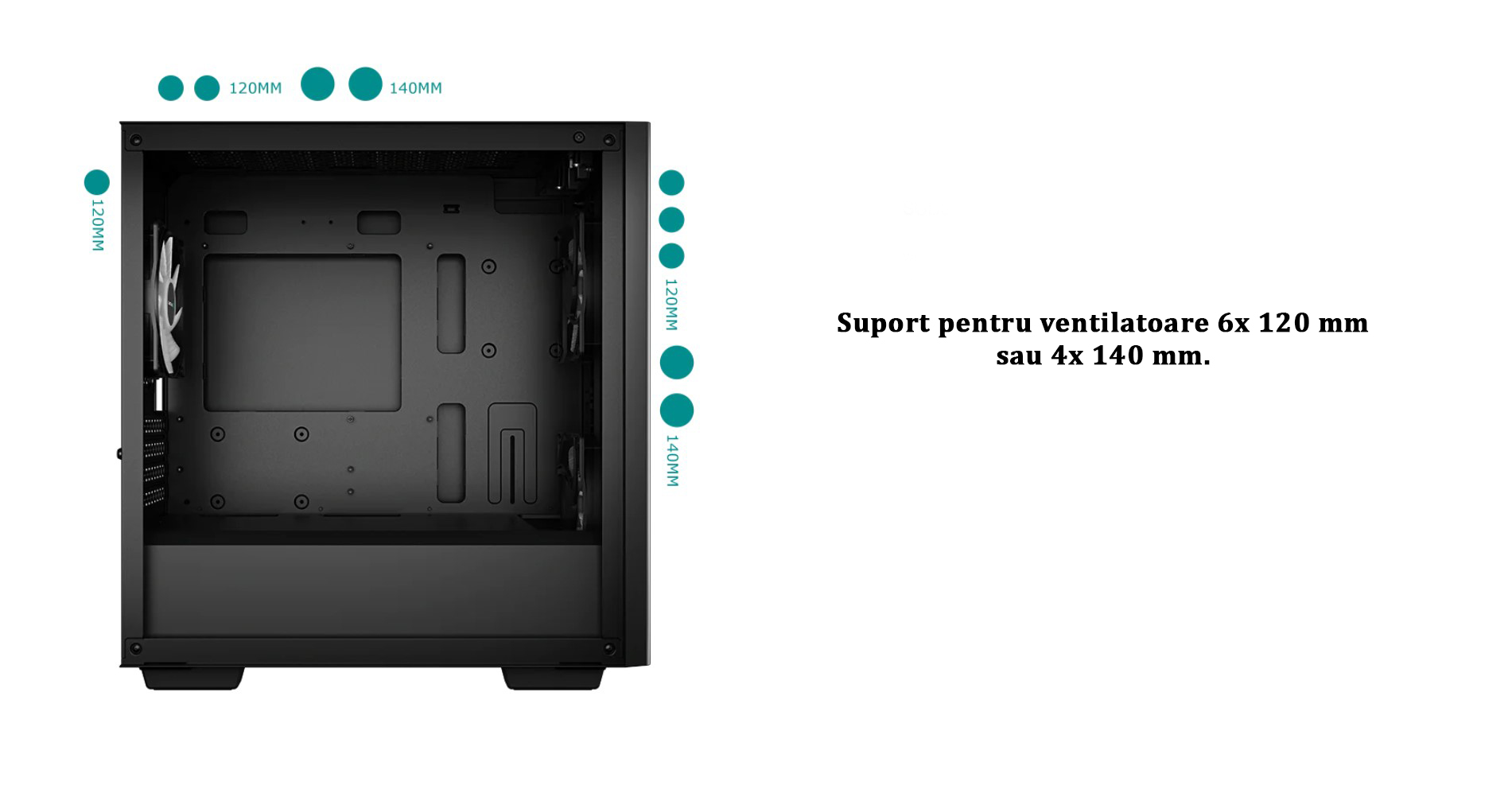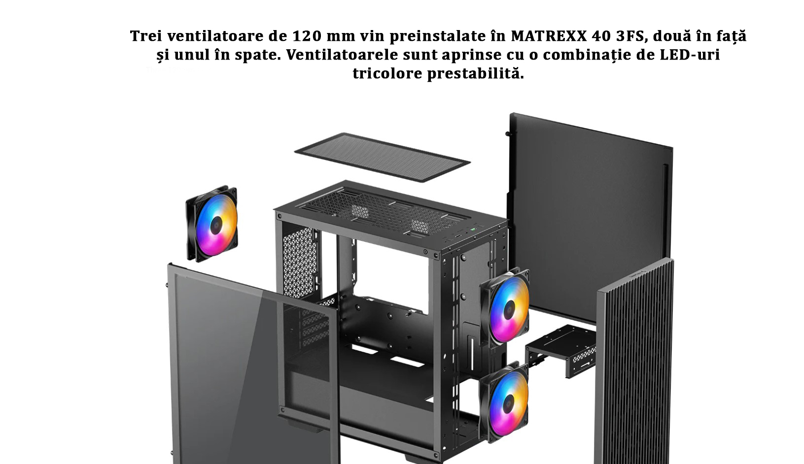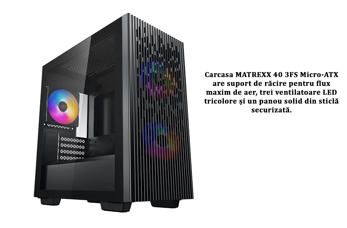 Deepcool Matrexx 40 3FS Case Black, ABS+SPCC Steel ATX Mid Tower, fara sursa (tip ATX, montata jos), interior vopsit negru, 2x3,5” (intern), 2x2,5” (intern), spate – 1x120mm fRGB fan (inclus), fata – 2x 120mm fRGB fan (inclus) / 1x 120mm (optional) / 2x 140mm (optional), tavan – 2x 120mm (optional) / 2x 140mm (optional), 1x USB 3.0, 1x USB 2.0, HD Audio, sloturi expansiune: x4, microATX / Mini-ITX, inaltime maxima cooler procesor: 165mm, lungime maxima placa video: 320mm, suport radiatoare water cooling: spate – 120mm, dimensiuni (LxWxH): 400x215x431mm, greutate: 5.52 kg