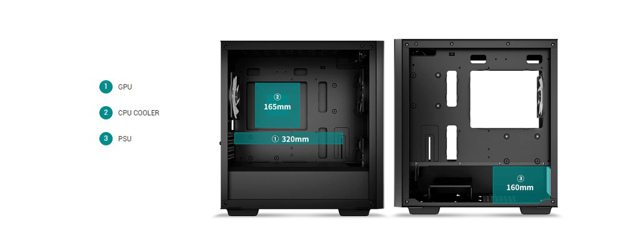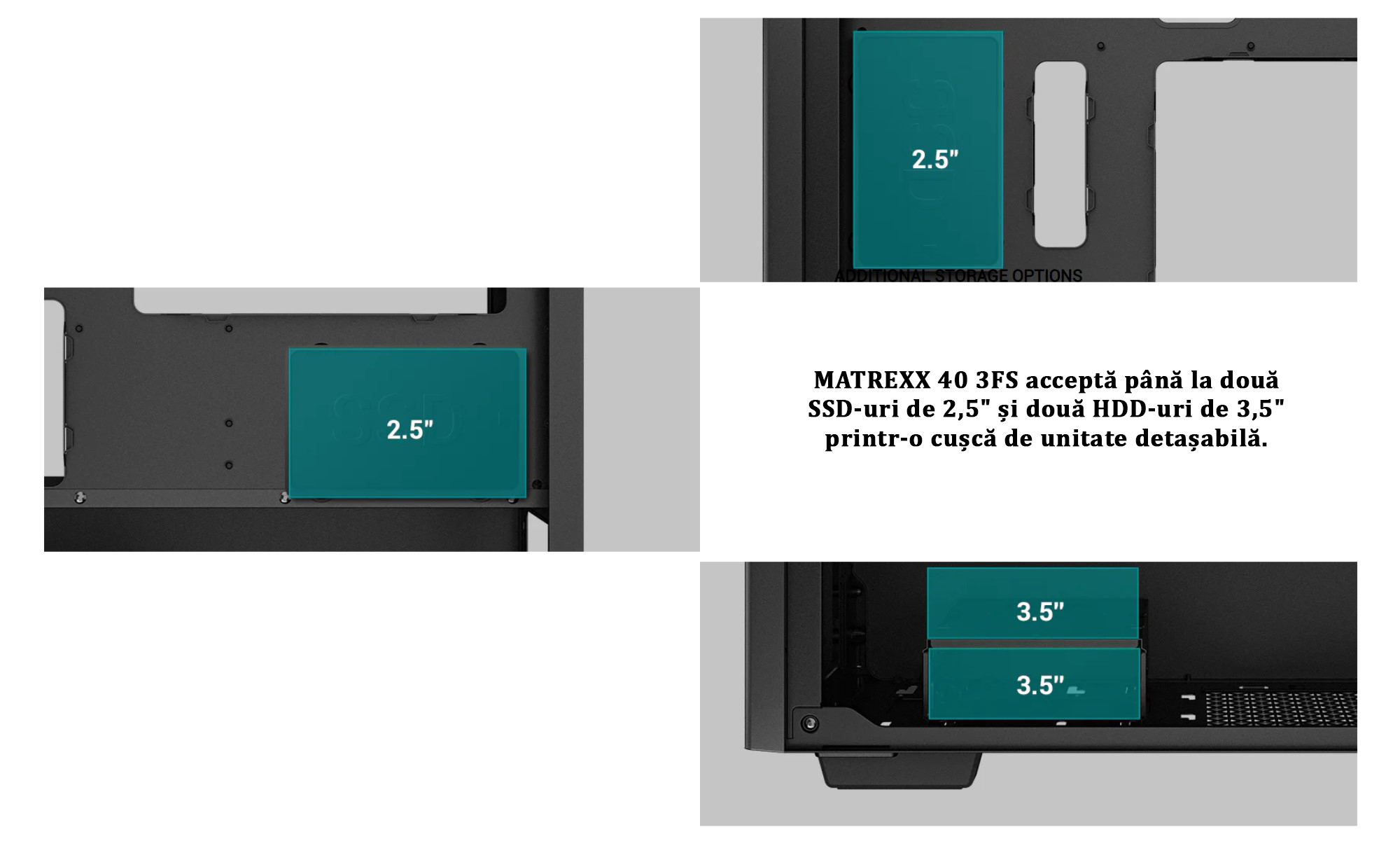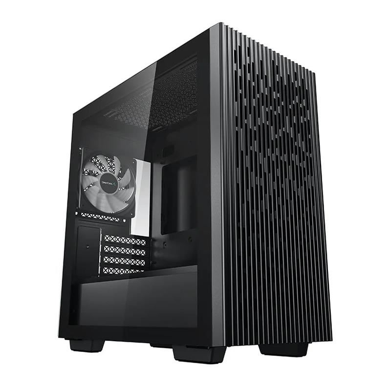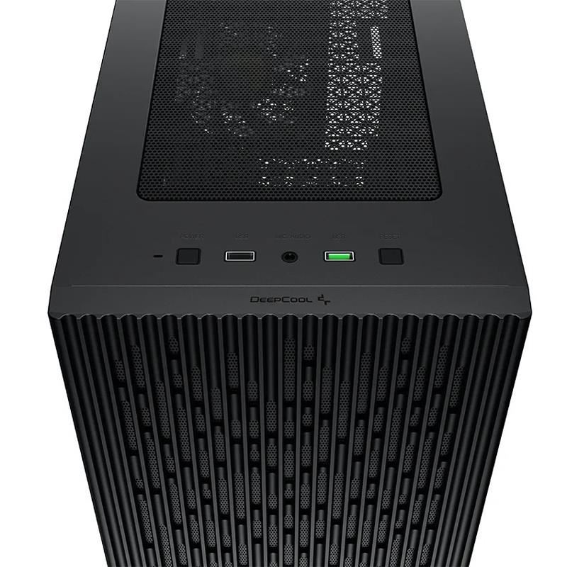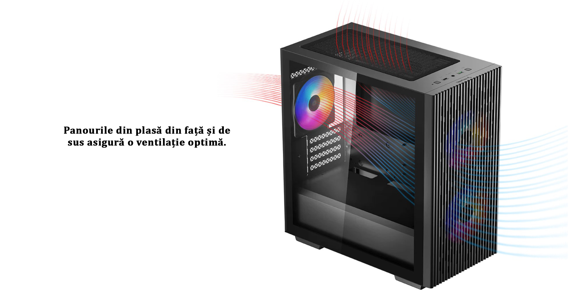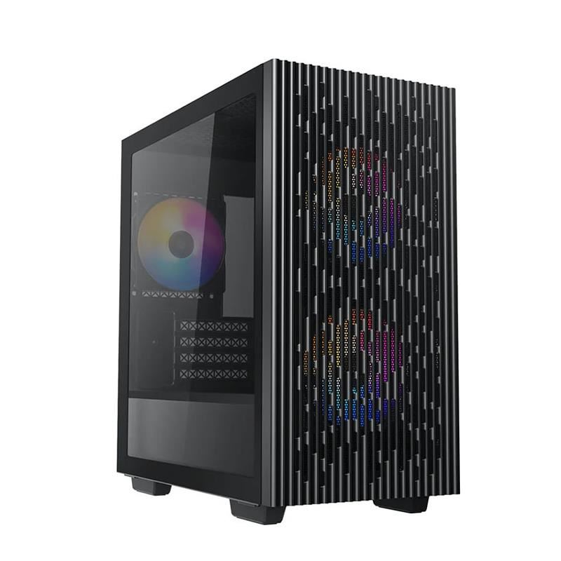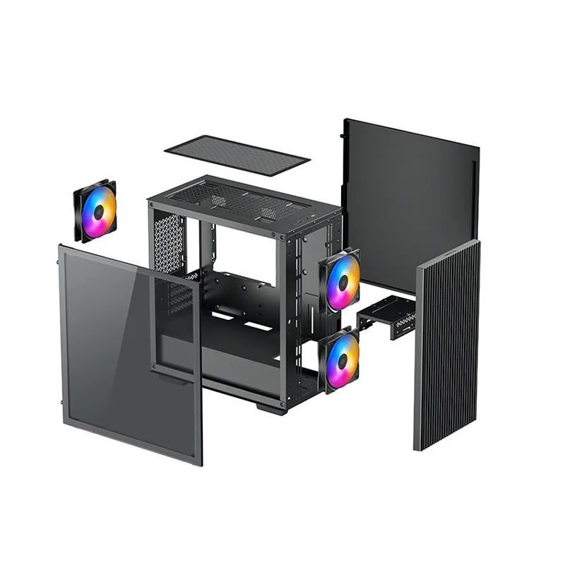 Deepcool Matrexx 40 3FS Case Black, ABS+SPCC Steel ATX Mid Tower, fara sursa (tip ATX, montata jos), interior vopsit negru, 2x3,5” (intern), 2x2,5” (intern), spate – 1x120mm fRGB fan (inclus), fata – 2x 120mm fRGB fan (inclus) / 1x 120mm (optional) / 2x 140mm (optional), tavan – 2x 120mm (optional) / 2x 140mm (optional), 1x USB 3.0, 1x USB 2.0, HD Audio, sloturi expansiune: x4, microATX / Mini-ITX, inaltime maxima cooler procesor: 165mm, lungime maxima placa video: 320mm, suport radiatoare water cooling: spate – 120mm, dimensiuni (LxWxH): 400x215x431mm, greutate: 5.52 kg
