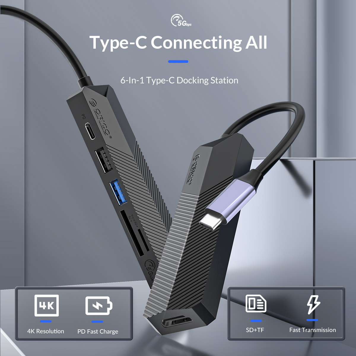 Docking station Orico MDK-4P USB Type-C gri, conectori: 1x USB Type-C (PD55W, pentru conectarea unui adaptor de curent), 1x USB 3.0 Type-A, 1x USB 2.0 Type-A, 1x HDMI 4K@30Hz, Plug & Play, rata de transfer: USB3.0:5Gbps, posibilitate hot swap, protectii: over current / over-voltage / short circuit protection, conector: USB Type-C, dimensiuni: 108x29x13mm