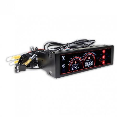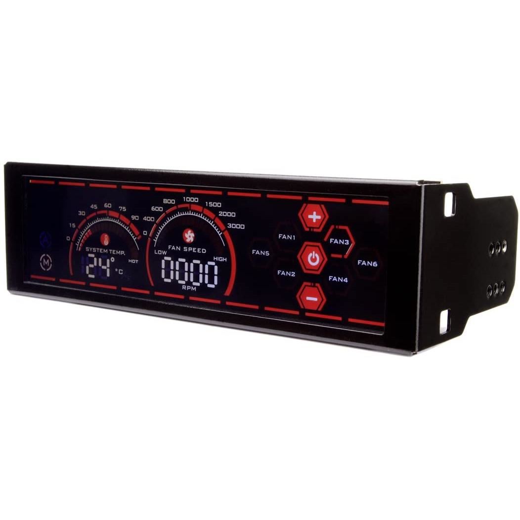 Fan controller Alseye A-100 iluminare rosie, fan controller 5.25” cu touch screen si senzori de temperatura, se pot controla 6 ventilatoare (se pot monta ventilatoare cu conectori cu 3pin sau 4pin), 6 senzori de temperatura, 6 canale (2x 24W + 4x 15W), alarma de temperatura, posibilitatea conectarii pompei al unui sistem LCS (liquid cooling system), dimensiuni: 147x66x42.6 mm, greutate: 258.8g