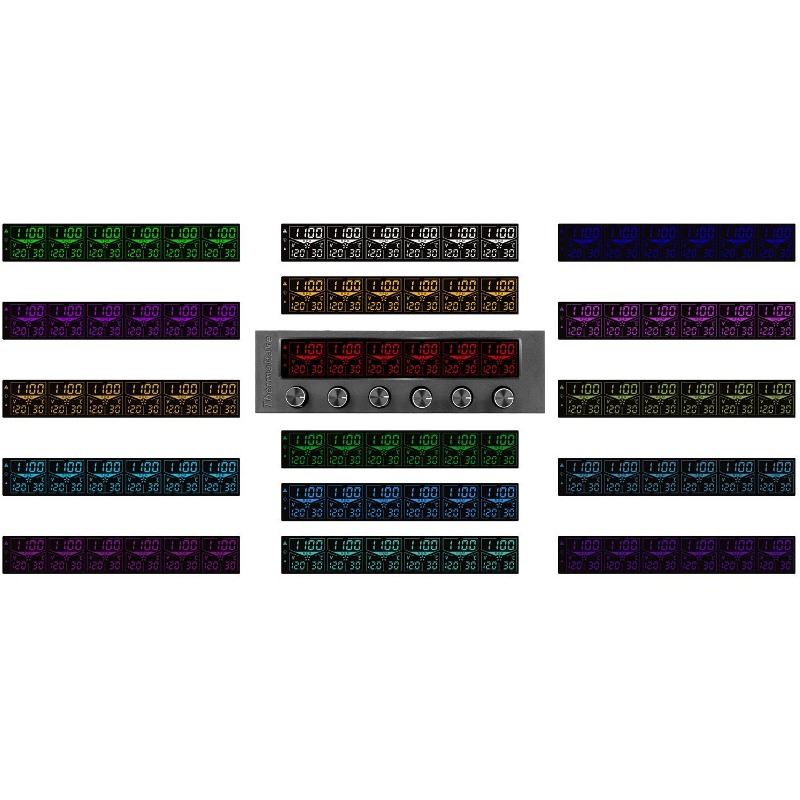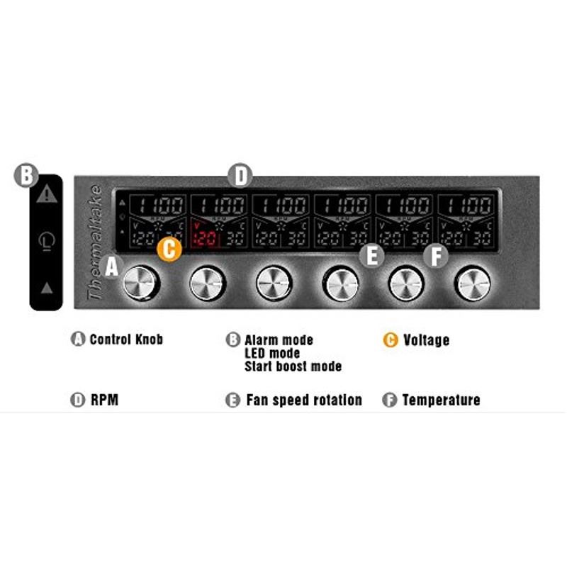 Thermaltake Commander F6 RGB LCD Multi fan controller, montare in bay de 5.25”, iluminare LCD RGB cu 16 culori disponibile, posibilitatea controlului vitezei ventilatoarelor cu o precizie ridicata (pas de reglare voltaj: 0.1V), se pot controla 6 ventilatoare (conectori 3-pin/4-pin PWM, 30W/canal, voltaj: 0V – 12V, viteza: 0 – 9990 RPM), 6 senzori de temperatora (interval de temperatura: 0 - 90 ℃), functie de alarma si protectie la scurt circuite, compatibil cu Thermaltake LUMI Color LED Strips monocrome sau cu alte benzi de iluminare LED monocroma care au conector compatibil (se poate ajusta intensitatea iluminarii), alimentare prin conector Molex, include: 6x probe temperatura, 6x cabluri ventilatoare 3pin/4pin, 2x cabluri LED to 3pin, dimensiuni: 90 x 150 x 43mm, greutate: 345g