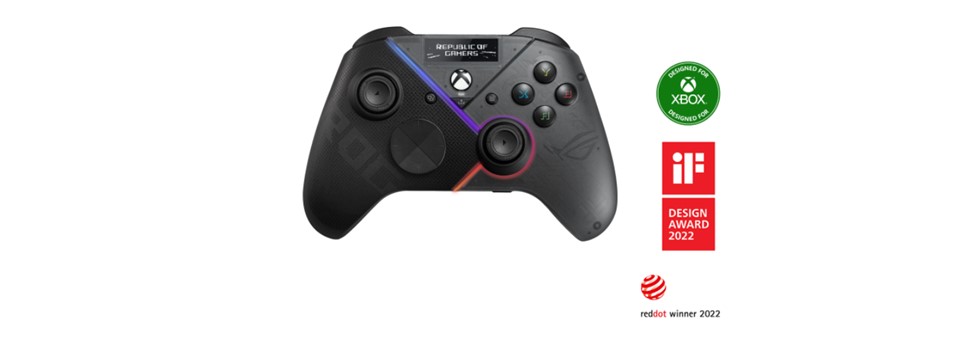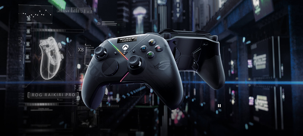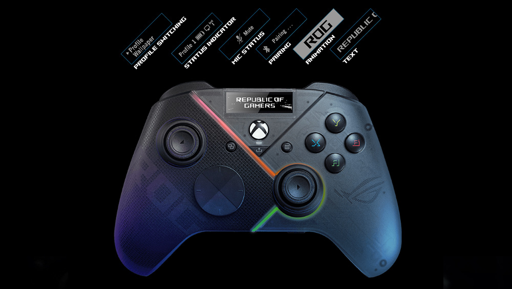 Controler gaming ASUS ROG RAIKIRI PRO, afișaj OLED încorporat, conectivitate tri-mod, patru butoane dorsale, trăgaciuri cu pas selectabil, ESS DAC, compatibilitate PC și Xbox