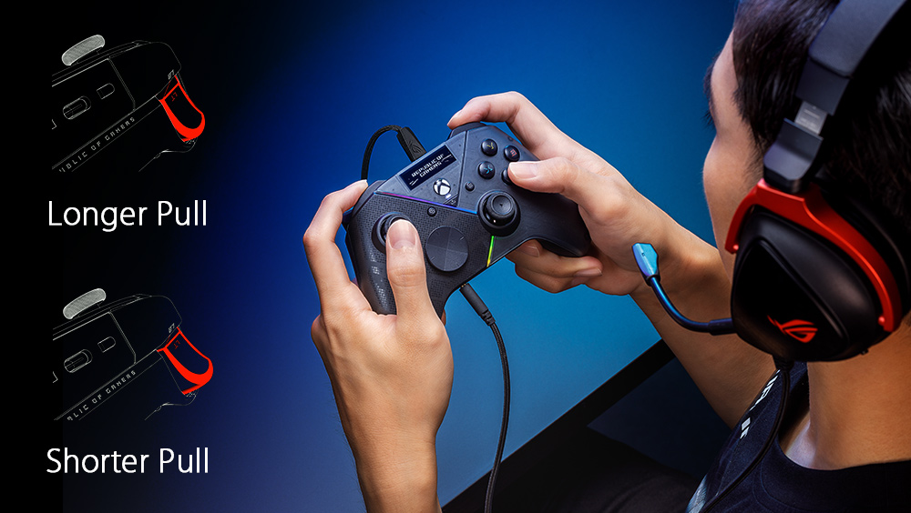 Trăgaciurile stânga și dreapta oferă o gamă completă de mișcări și includ un mod de blocare a trăgaciului scurt. Zonele moarte ale trăgaciului pot fi personalizate prin intermediul Armoury Crate pentru a se potrivi preferințelor utilizatorului.