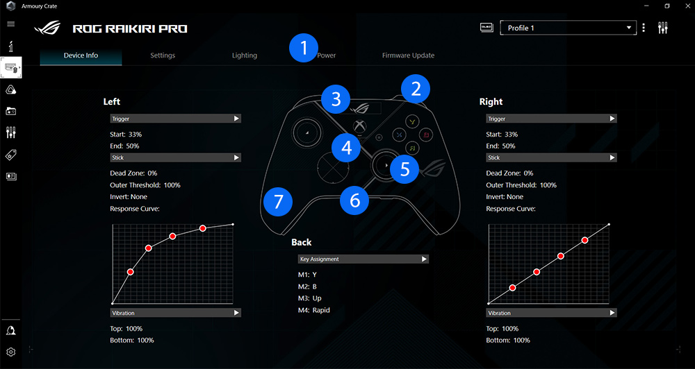 Folosește aplicația Armoury Crate pentru a personaliza comenzile în funcție de stilul tău de joc sau de orice joc. Sunt posibile o multitudine de opțiuni de personalizare, ceea ce îți permite să remapezi butoanele, să ajustezi setările afișajului OLED, să selectezi profilul controlerului și să setezi alerte de baterie descărcată pentru modul wireless. De asemenea, poți ajusta intensitatea vibrațiilor și zonele moarte ale trăgaciurilor, precum și curbele de răspuns ale joystick-ului.